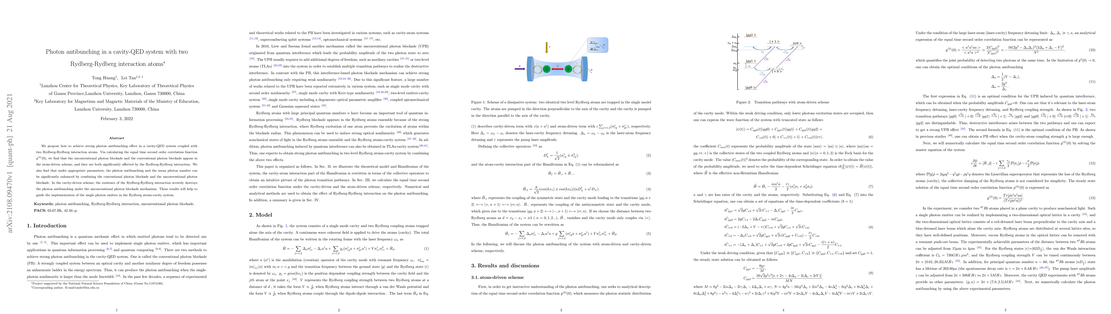 We propose how to achieve strong photon antibunching effect in a cavity-QED system coupled with two Rydberg-Rydberg interaction atoms. Via calculating the equal time second order correlation function g(2)(0), we find that the unconventional photon blockade and the conventional photon blockade appear in the atom-driven scheme, and they are both significantly affected by the Rydberg-Rydberg interaction. We also find that under appropriate parameters, the photon antibunching and the mean photon number can be significantly enhanced by combining the conventional photon blockade and the unconventional photon blockade. In the cavity-driven scheme, the existence of the Rydberg-Rydberg interaction severely destroys the photon antibunching under the unconventional photon blockade mechanism. These results will help to guide the implementation of the single photon emitter in the Rydberg atoms-cavity system.