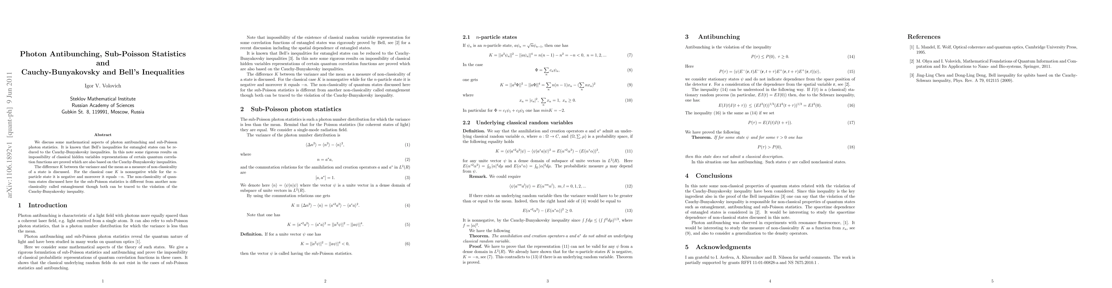 This paper explores the mathematical foundations of photon antibunching and sub-Poisson statistics, linking them to Cauchy-Bunyakovsky inequalities. It proves the impossibility of classical hidden variable representations for certain quantum correlations, highlighting the non-classical nature of quantum states through the difference K between variance and mean, which is negative for n-particle states.
