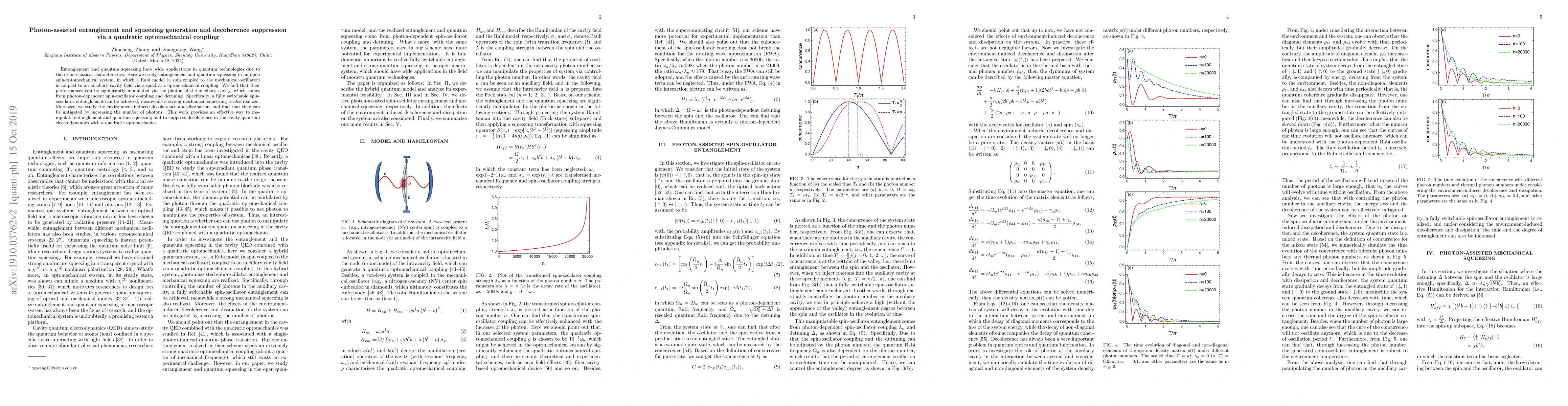 This paper explores entanglement and squeezing generation in an open spin-optomechanical system via quadratic optomechanical coupling, demonstrating significant modulation by ancillary cavity photons. It also shows that decoherence can be suppressed by increasing photon numbers, providing a method to control quantum properties in cavity quantum electrodynamics.