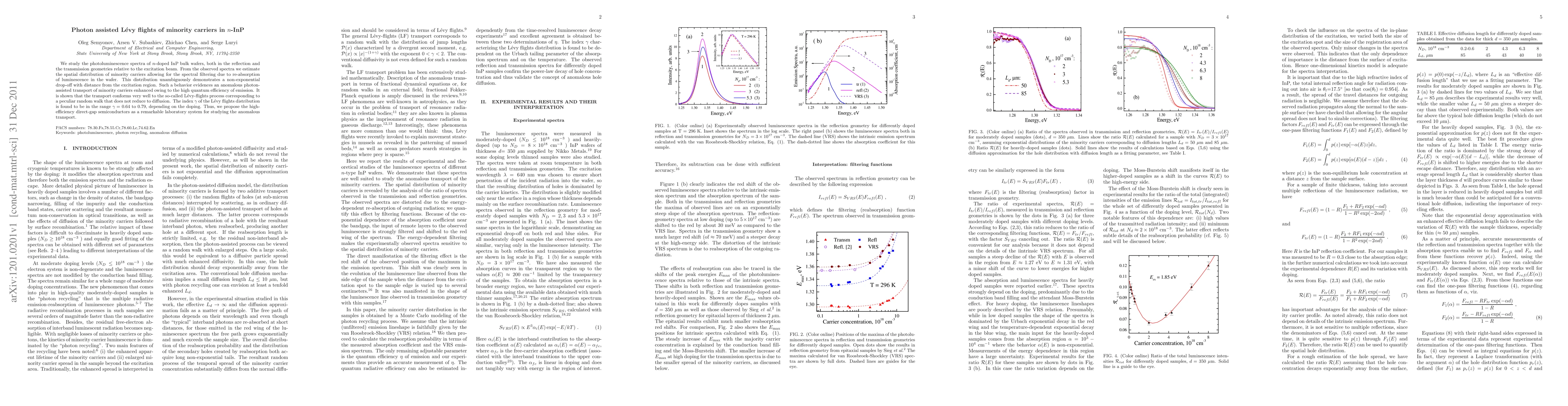 This paper investigates the photoluminescence spectra of n-doped InP wafers, revealing a non-exponential distribution of minority carriers indicative of photon-assisted Levy flights, a non-diffusive random walk process. The study finds the Levy flights index gamma to range from 0.64 to 0.79, suggesting high-efficiency direct-gap semiconductors as ideal systems for studying such anomalous transport.