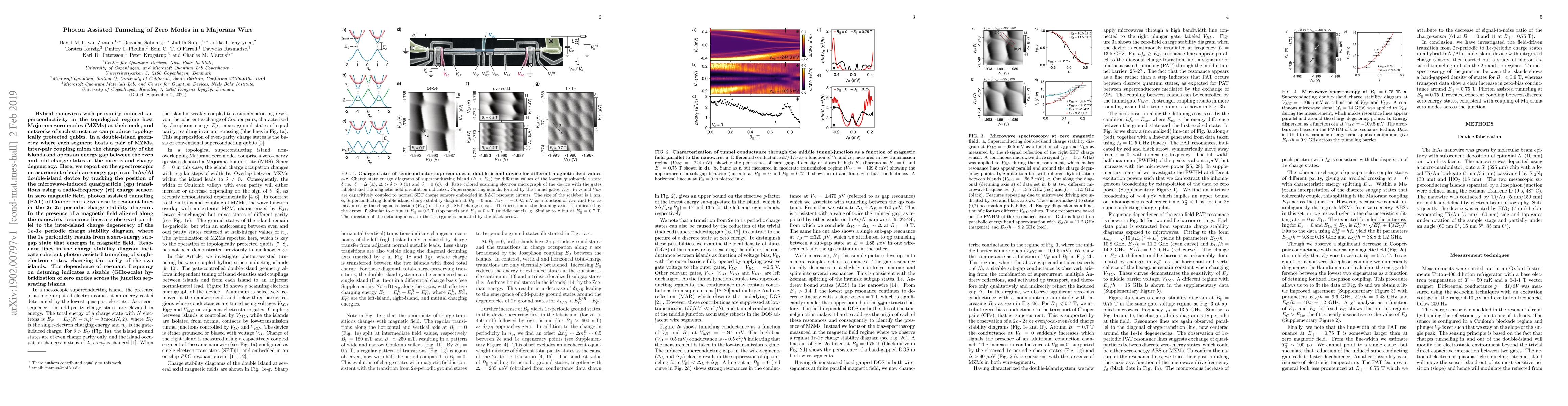 Hybrid nanowires with proximity-induced superconductivity in the topological regime host Majorana zero modes (MZMs) at their ends, and networks of such structures can produce topologically protected qubits. In a double-island geometry where each segment hosts a pair of MZMs, inter-pair coupling mixes the charge parity of the islands and opens an energy gap between the even and odd charge states at the inter-island charge degeneracy. Here, we report on the spectroscopic measurement of such an energy gap in an InAs/Al double-island device by tracking the position of the microwave-induced quasiparticle (qp) transitions using a radio-frequency (rf) charge sensor. In zero magnetic field, photon assisted tunneling (PAT) of Cooper pairs gives rise to resonant lines in the 2e-2e periodic charge stability diagram. In the presence of a magnetic field aligned along the nanowire, resonance lines are observed parallel to the inter-island charge degeneracy of the 1e-1e periodic charge stability diagram, where the 1e periodicity results from a zero-energy sub-gap state that emerges in magnetic field. Resonant lines in the charge stability diagram indicate coherent photon assisted tunneling of single-electron states, changing the parity of the two islands. The dependence of resonant frequency on detuning indicates a sizable (GHz-scale) hybridization of zero modes across the junction separating islands.