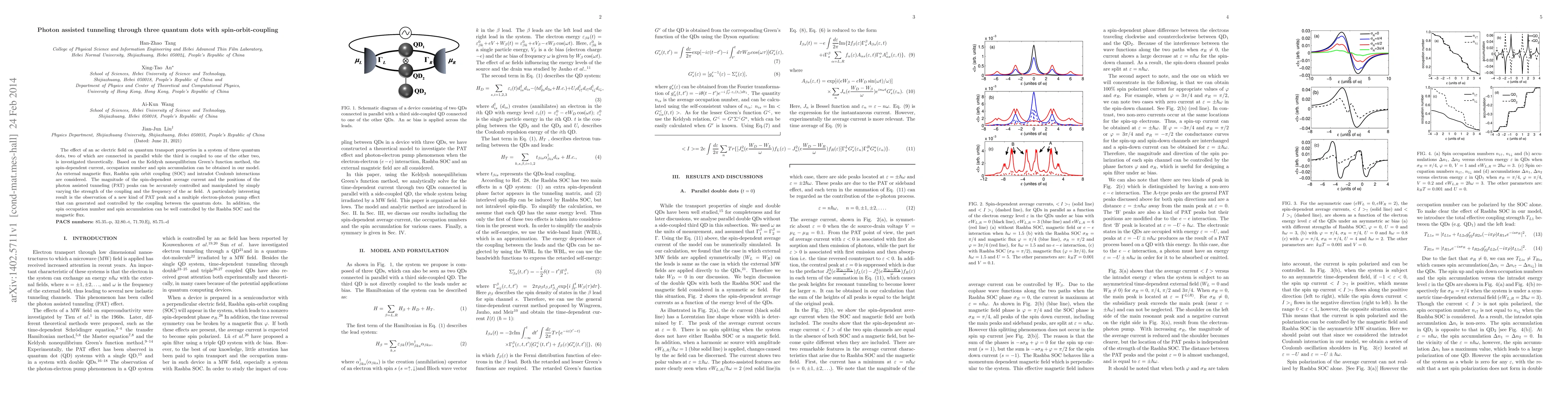 This paper investigates quantum transport through a system of three quantum dots under an ac electric field, demonstrating control over spin-dependent current and photon-assisted tunneling peaks via varying coupling and field frequency. The study highlights new PAT peaks and a multi-electron-photon pump effect, with spin properties influenced by Rashba spin-orbit coupling and magnetic flux.