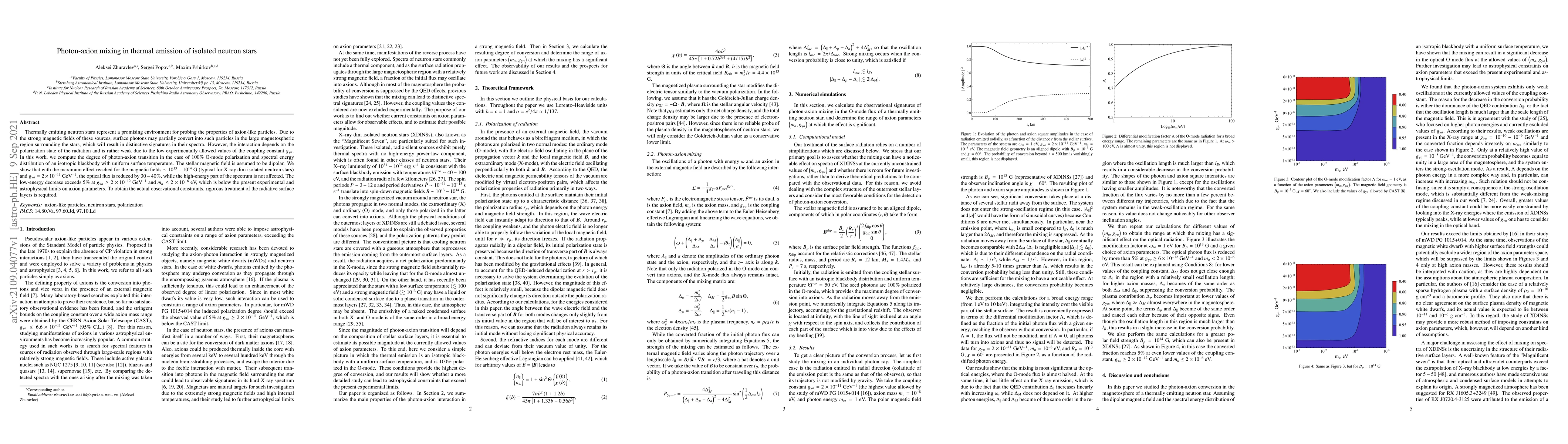 This paper investigates photon-axion mixing in the thermal emission from isolated neutron stars, focusing on the O-mode polarization scenario. It finds that for magnetic fields around $10^{13}$ - $10^{14}$ G and coupling constants $g_{\gamma a} \leq 2 \times 10^{-11}$ GeV$^{-1}$, the optical flux can decrease by 30-40%, while the high-energy spectrum remains unaffected.