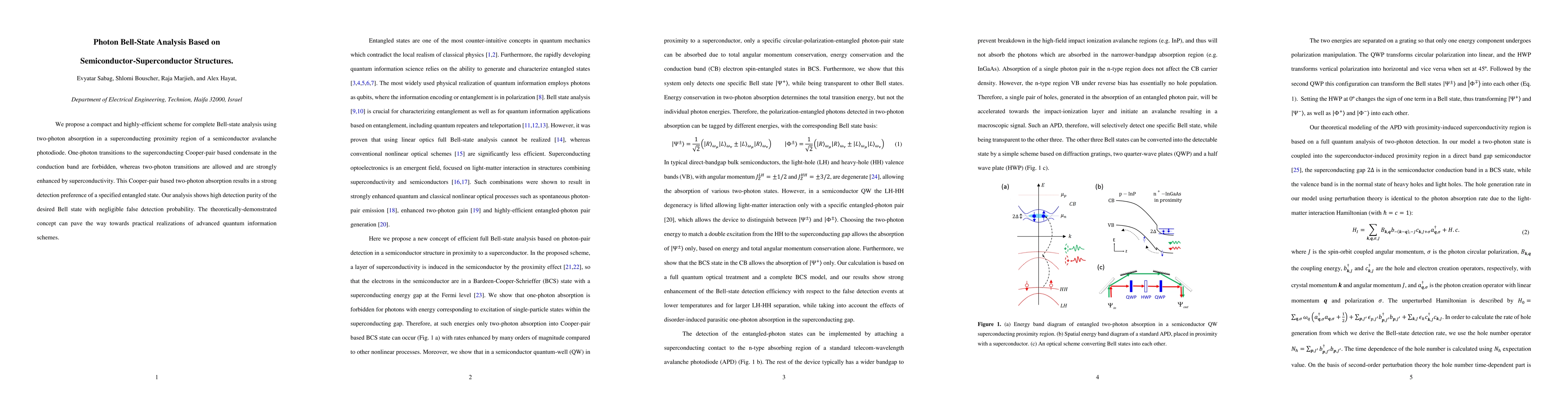 We propose a compact and highly-efficient scheme for complete Bell-state analysis using two-photon absorption in a superconducting proximity region of a semiconductor avalanche photodiode. One-photon transitions to the superconducting Cooper-pair based condensate in the conduction band are forbidden, whereas two-photon transitions are allowed and are strongly enhanced by superconductivity. This Cooper-pair based two-photon absorption results in a strong detection preference of a specified entangled state. Our analysis shows high detection purity of the desired Bell state with negligible false detection probability. The theoretically-demonstrated concept can pave the way towards practical realizations of advanced quantum information schemes.
