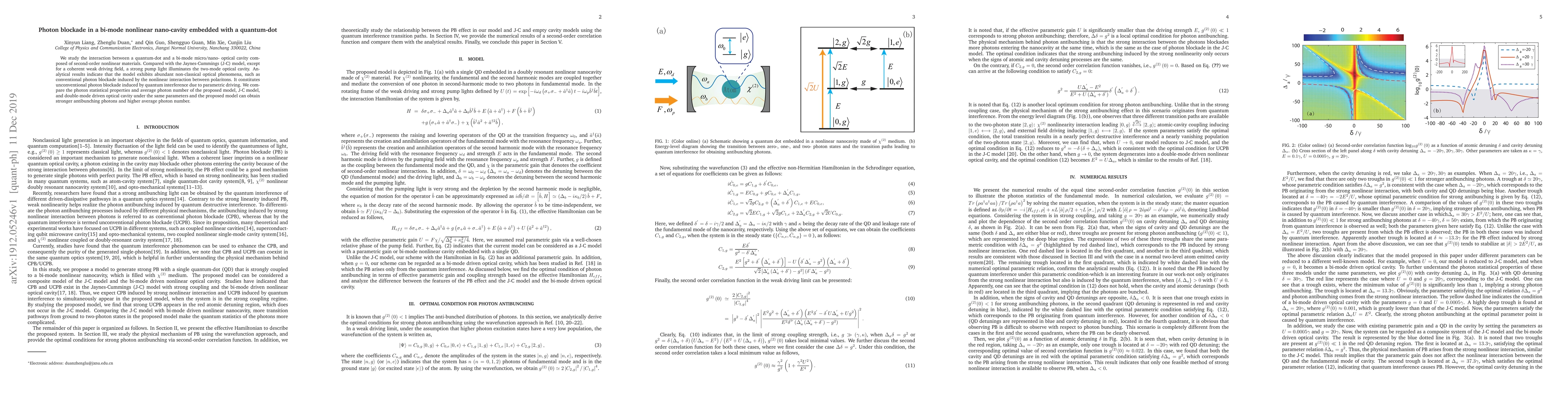 We study the interaction between a quantum-dot and a bi-mode micro/nano-optical cavity composed of second-order nonlinear materials. Compared with the Jaynes-Cummings (J-C) model, except for a coherent weak driving field, a strong pump light illuminates the two-mode optical cavity. Analytical results indicate that the model exhibits abundant non-classical optical phenomena, such as conventional photon blockade induced by the nonlinear interaction between polaritons. It constitutes unconventional photon blockade induced by quantum interference due to parametric driving. We compare the photon statistical properties and average photon number of the proposed model, J-C model, and double-mode driven optical cavity under the same parameters and the proposed model can obtain stronger antibunching photons and higher average photon number.