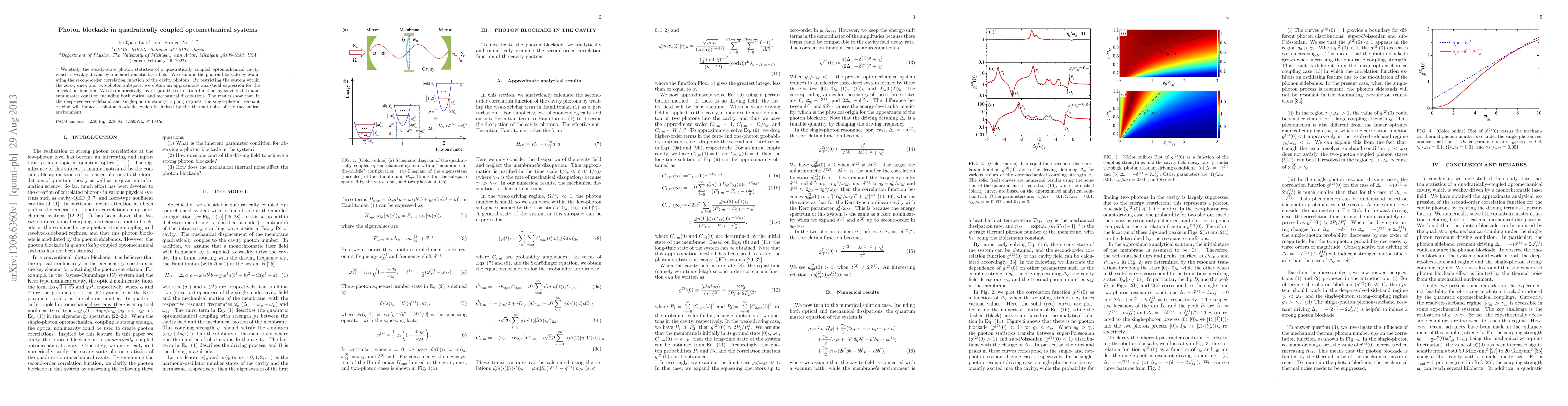 This paper investigates the photon blockade in quadratically coupled optomechanical systems driven by a monochromatic laser, showing that single-photon resonant driving induces a photon blockade in the deep-resolved-sideband regime, with limitations imposed by thermal noise. Analytical and numerical approaches are used to study the second-order correlation function.
