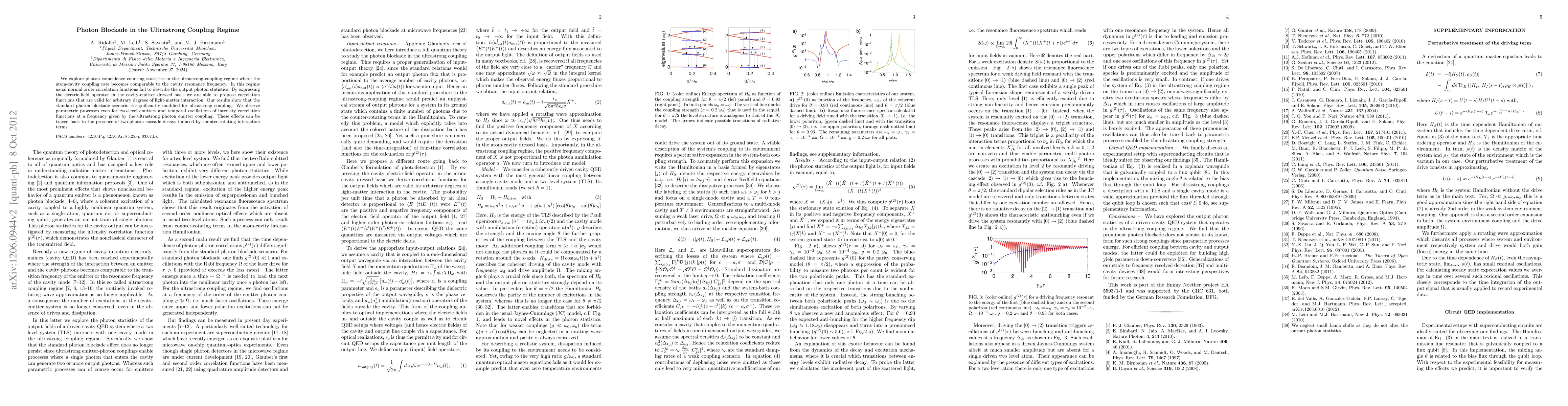 This paper investigates photon blockade in the ultrastrong coupling regime, where atom-cavity coupling equals the cavity resonance frequency, showing modified photon statistics and new correlation functions. The study reveals parametric processes and intensity oscillations due to two-photon cascade decays from counter-rotating interaction terms.