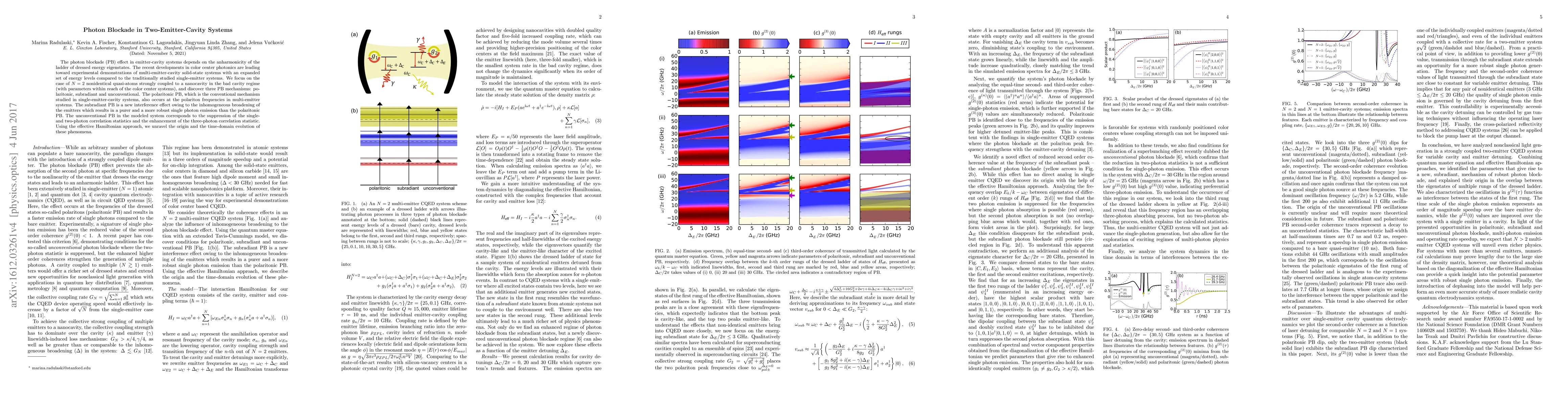 This paper explores the photon blockade effect in two-emitter-cavity systems, identifying three mechanisms: polaritonic, subradiant, and unconventional. The subradiant mechanism offers a purer and more robust single photon emission, while the unconventional mechanism enhances three-photon correlation statistics.