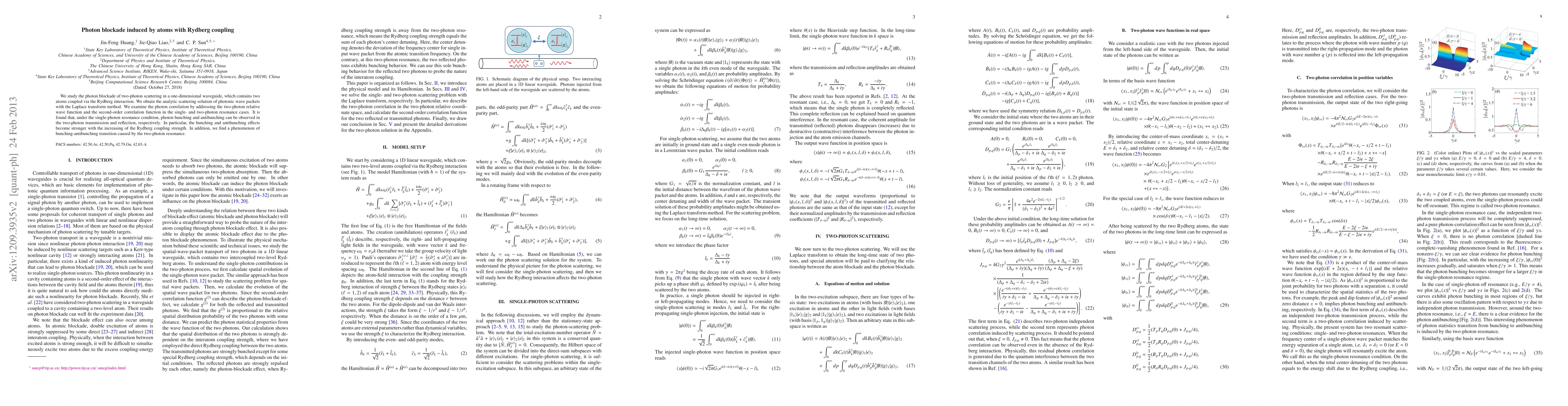 This paper investigates the photon blockade in a waveguide with two Rydberg-coupled atoms, revealing photon bunching and antibunching under single-photon resonance conditions. The study also identifies a transition from bunching to antibunching due to two-photon resonance, with effects amplified by stronger Rydberg coupling.