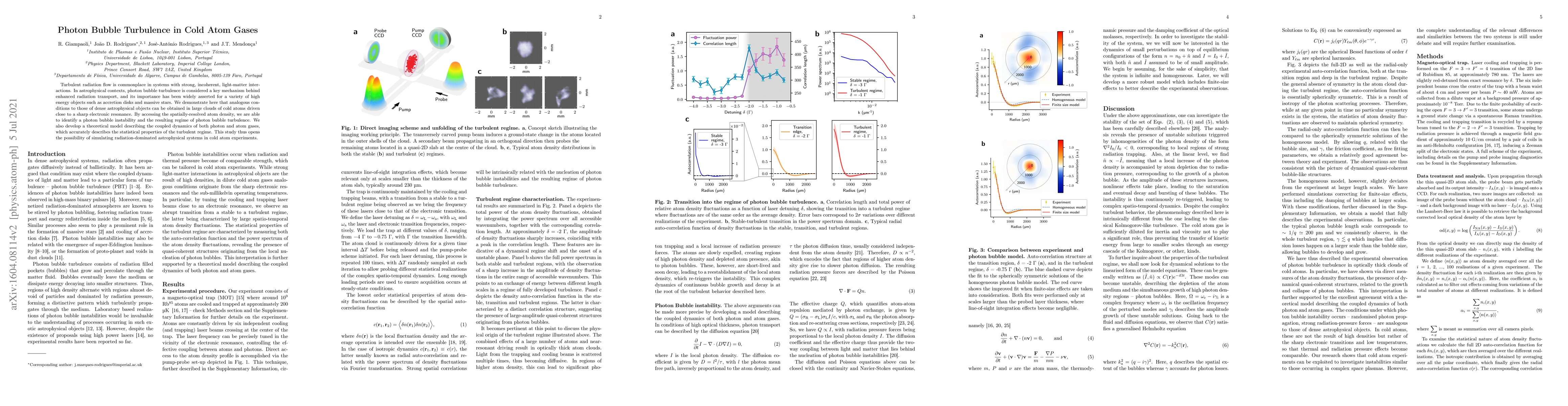 This paper demonstrates the occurrence of photon bubble turbulence in cold atom gases, mimicking astrophysical systems, and develops a theoretical model for the coupled dynamics of photon and atom gases, providing a new method for simulating radiation-dominated astrophysical phenomena in laboratory settings.