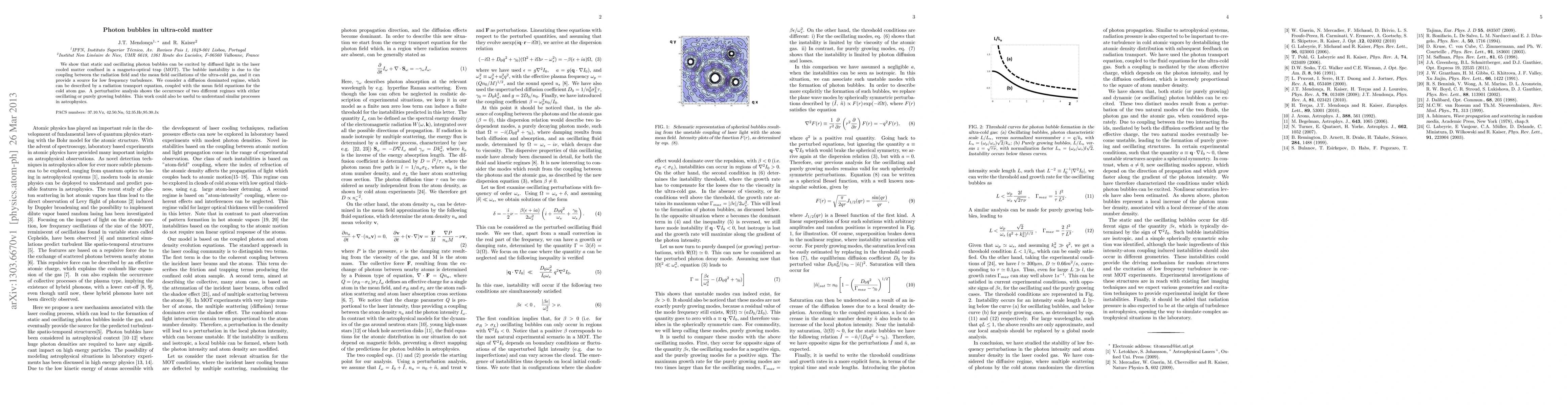 The paper presents a comprehensive analysis of photon bubble instabilities in ultra-cold matter, combining radiation transport equations with mean field equations for cold atom gases, and identifies two distinct regimes of bubble behavior.