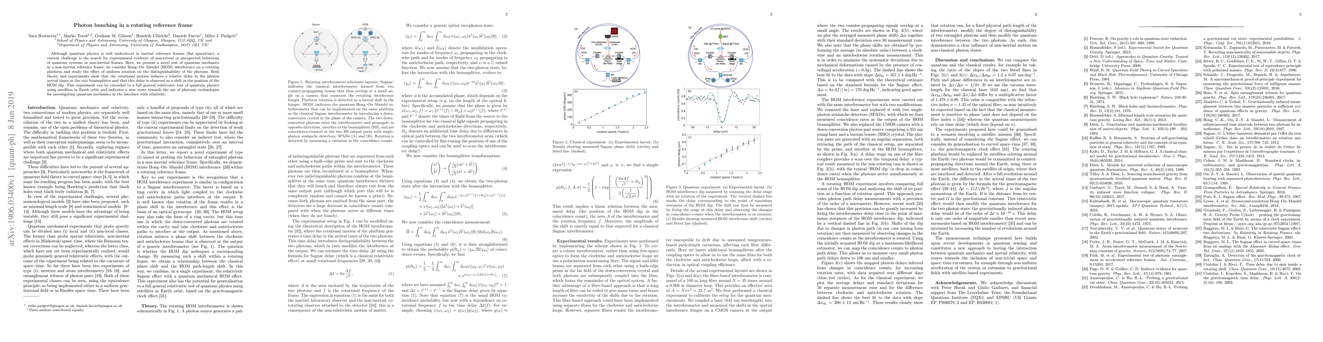 This paper investigates quantum mechanics in a rotating reference frame by studying photon bunching effects via Hong-Ou-Mandel interference on a rotating platform. The experiment reveals a relative delay in photon arrival times due to rotation, shifting the position of the HOM dip, thus providing a novel test of quantum physics in non-inertial frames.