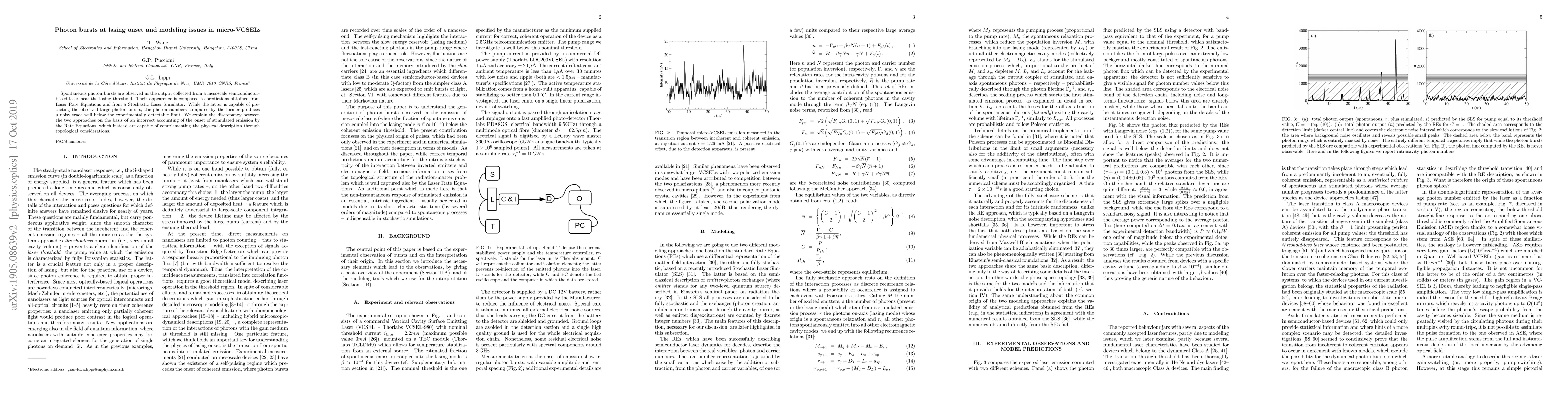 This paper investigates spontaneous photon bursts in micro-VCSELs near the lasing threshold, comparing experimental observations with predictions from Laser Rate Equations and a Stochastic Laser Simulator. The Stochastic model accurately predicts large photon bursts, while the Rate Equations fail to do so, highlighting issues in modeling the onset of stimulated emission.