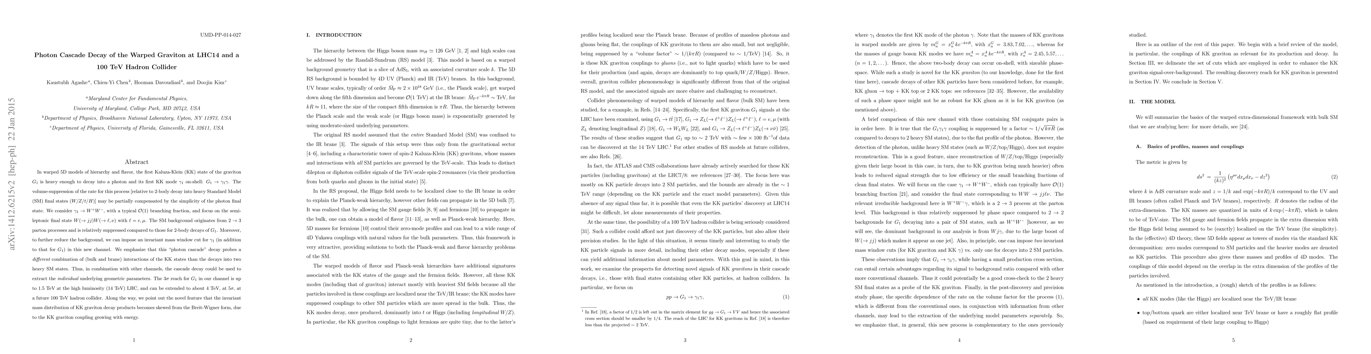 In warped 5D models of hierarchy and flavor, the first Kaluza-Klein (KK) state of the graviton $G_1$ is heavy enough to decay into a photon and its first KK mode $\gamma_1$ on-shell: $G_1 \to \gamma_1 \gamma$. The volume-suppression of the rate for this process [relative to 2-body decay into heavy Standard Model (SM) final states ($W/Z/t/H$)] may be partially compensated by the simplicity of the photon final state. We consider $\gamma_1 \to W^+W^-$, with a typical O(1) branching fraction, and focus on the semi-leptonic final state $W(\to jj) W(\to \ell, \nu)$ with $\ell=e,\mu$. The SM background originates from $2\to 3$ parton processes and is relatively suppressed compared to those for 2-body decays of $G_1$. Moreover, to further reduce the background, we can impose an invariant mass window cut for $\gamma_1$ (in addition to that for $G_1$) in this new channel. We emphasize that this "photon cascade" decay probes a different combination of (bulk and brane) interactions of the KK states than the decays into two heavy SM states. Thus, in combination with other channels, the cascade decay could be used to extract the individual underlying geometric parameters. The $3\sigma$ reach for $G_1$ in our channel is up to 1.5 TeV at the high luminosity (14 TeV) LHC, and can be extended to about 4 TeV, at $5\sigma$, at a future 100 TeV hadron collider. Along the way, we point out the novel feature that the invariant mass distribution of KK graviton decay products becomes skewed from the Breit-Wigner form, due to the KK graviton coupling growing with energy.