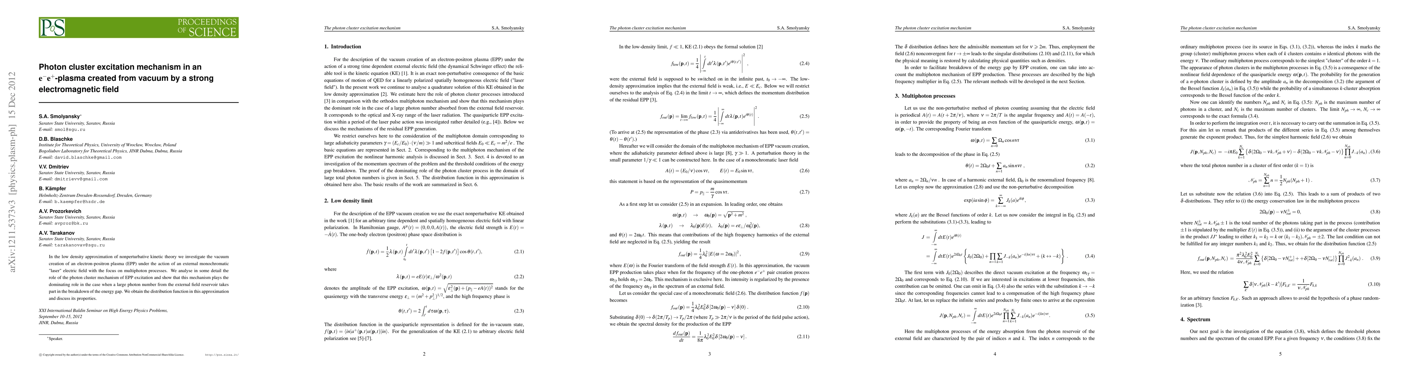 In the low density approximation of nonperturbative kinetic theory we investigate the vacuum creation of an electron-positron plasma (EPP) under the action of an external monochromatic "laser" electric field with the focus on multiphoton processes. We analyse in some detail the role of the photon cluster mechanism of EPP excitation and show that this mechanism plays the dominating role in the case when a large photon number from the external field reservoir takes part in the breakdown of the energy gap. We obtain the distribution function in this approximation and discuss its properties.