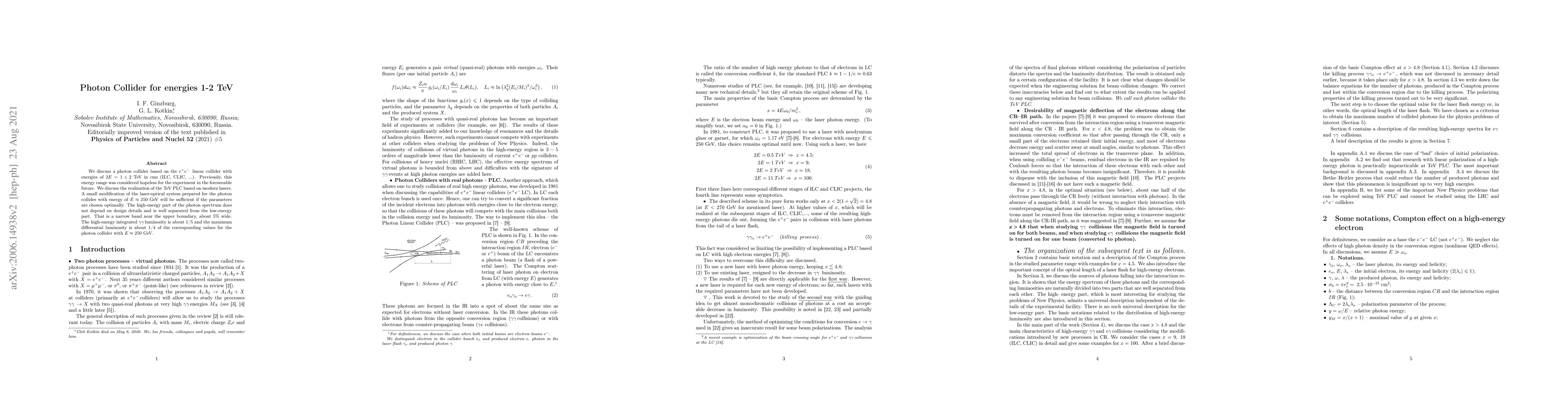 We discuss a photon collider based on the $e^+e^-$ \ linear collider with energies of $2E = 1\div 2$ TeV in cms (ILC, CLIC, ...). Previously, this energy range was considered hopeless for the experiment in the foreseeable future. We discuss the realization of the TeV PLC based on modern lasers. A small modification of the laser-optical system prepared for the photon collider with energy of $E \approx 250$ GeV will be sufficient if the parameters are chosen optimally. The high-energy part of the photon spectrum does not depend on design details and is well separated from the low-energy part. That is a narrow band near the upper boundary, about 5\% wide. The high-energy integrated \ggam luminosity is about 1/5 and the maximum differential luminosity is about 1/4 of the corresponding values for the photon collider with $E \approx 250$ GeV.