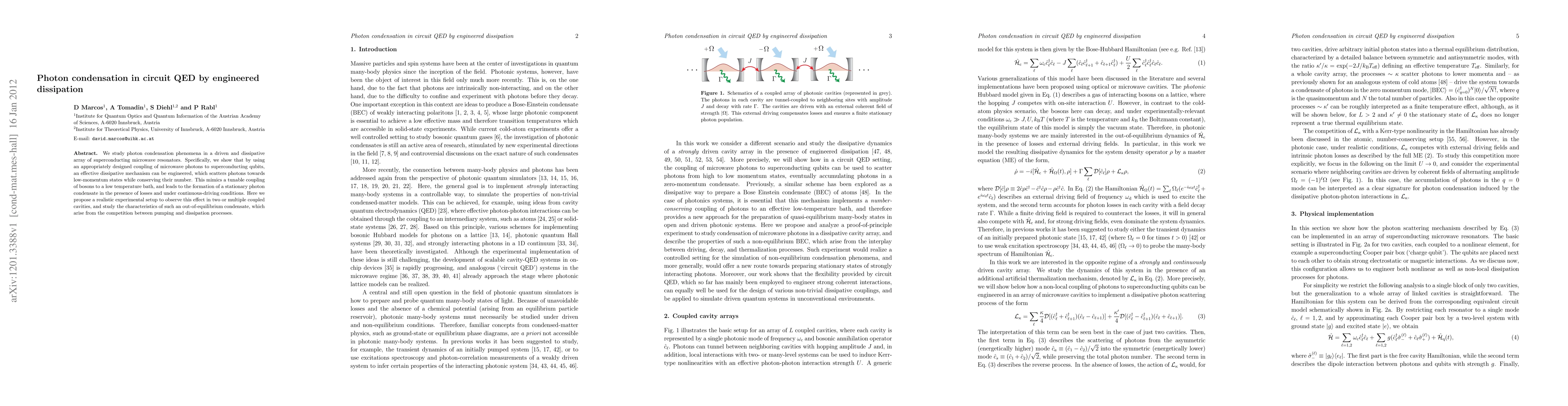 We study photon condensation phenomena in a driven and dissipative array of superconducting microwave resonators. Specifically, we show that by using an appropriately designed coupling of microwave photons to superconducting qubits, an effective dissipative mechanism can be engineered, which scatters photons towards low-momentum states while conserving their number. This mimics a tunable coupling of bosons to a low temperature bath, and leads to the formation of a stationary photon condensate in the presence of losses and under continuous-driving conditions. Here we propose a realistic experimental setup to observe this effect in two or multiple coupled cavities, and study the characteristics of such an out-of-equilibrium condensate, which arise from the competition between pumping and dissipation processes.