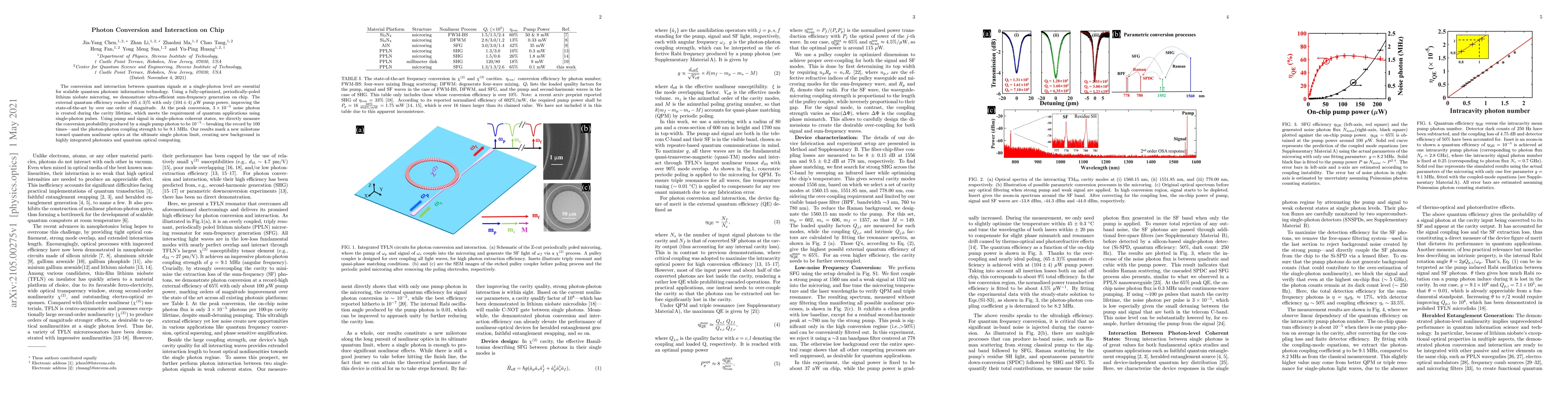 The conversion and interaction between quantum signals at a single-photon level are essential for scalable quantum photonic information technology. Using a fully-optimized, periodically-poled lithium niobate microring, we demonstrate ultra-efficient sum-frequency generation on chip. The external quantum efficiency reaches $(65\pm3)\%$ with only $(104\pm4)$ $\mu$W pump power, improving the state-of-the-art by over one order of magnitude. At the peak conversion, $3\times10^{-5}$ noise photon is created during the cavity lifetime, which meets the requirement of quantum applications using single-photon pulses. Using pump and signal in single-photon coherent states, we directly measure the conversion probability produced by a single pump photon to be $10^{-5}$ -- breaking the record by 100 times -- and the photon-photon coupling strength to be 9.1 MHz. Our results mark a new milestone toward quantum nonlinear optics at the ultimate single photon limit, creating new background in highly integrated photonics and quantum optical computing.