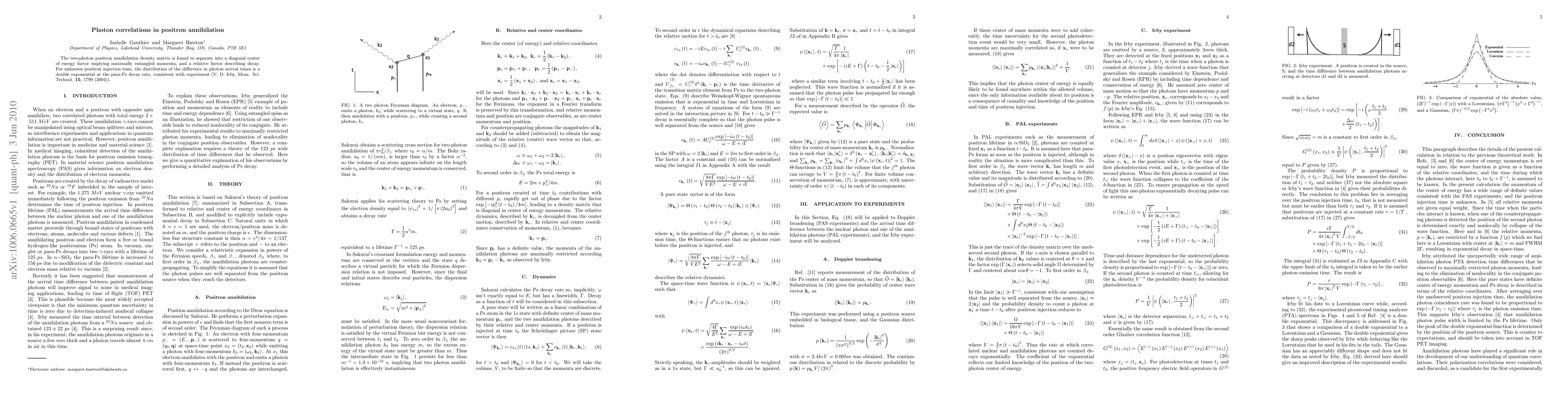 This paper investigates the two-photon density matrix from positron annihilation, revealing a diagonal center of energy factor indicating maximal momentum entanglement and a relative decay factor. Experimentally, the distribution of photon arrival times aligns with a double exponential decay rate.