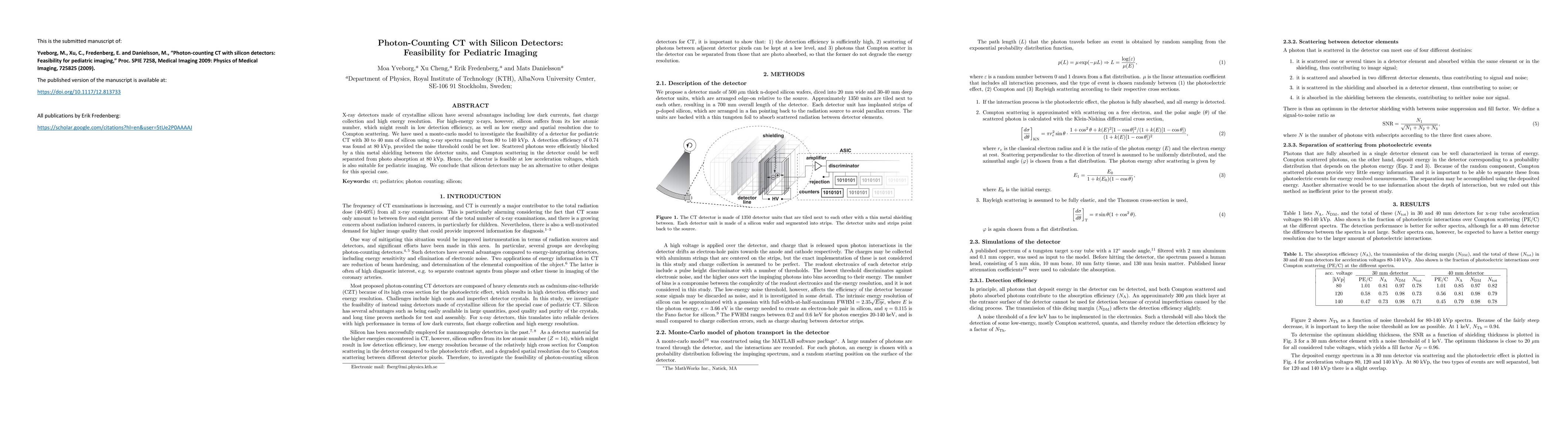 This study explores the feasibility of silicon-based photon-counting detectors for pediatric CT imaging, finding a detection efficiency of 0.74 at 80 kVp with effective scattering reduction, suggesting silicon detectors as a viable alternative to other designs for pediatric imaging.