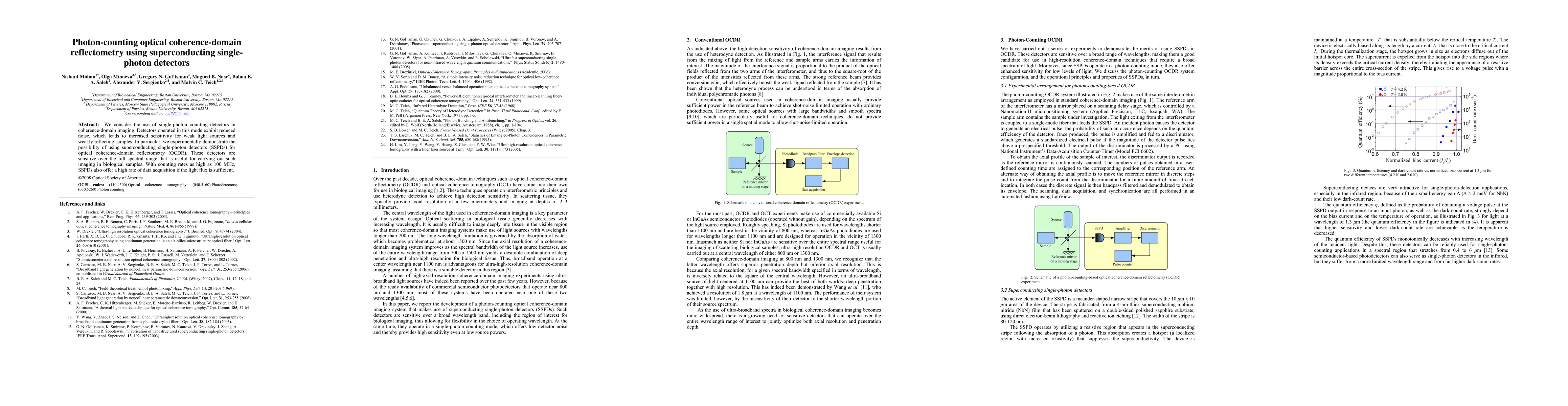 This paper explores the application of superconducting single-photon detectors (SSPDs) in photon-counting optical coherence-domain reflectometry (OCDR), demonstrating enhanced sensitivity for weak light sources and reflecting samples. The use of SSPDs provides high-speed data acquisition and broad spectral sensitivity suitable for biological imaging.