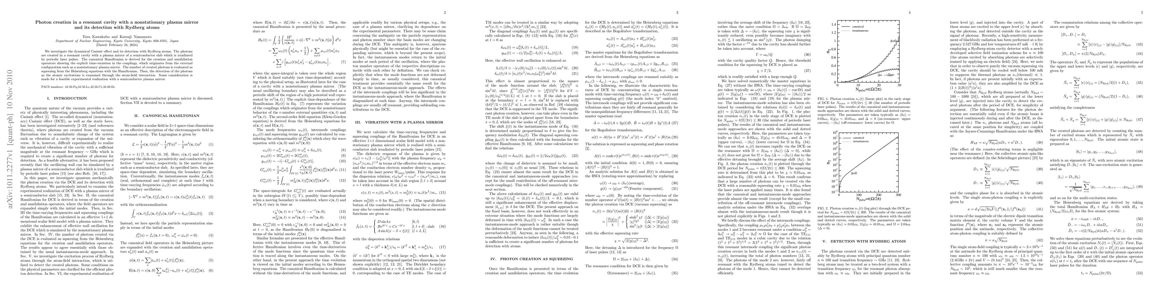 We investigate the dynamical Casimir effect and its detection with Rydberg atoms. The photons are created in a resonant cavity with a plasma mirror of a semiconductor slab which is irradiated by periodic laser pulses. The canonical Hamiltonian is derived for the creation and annihilation operators showing the explicit time-variation in the couplings, which originates from the external configuration such as a nonstationary plasma mirror. The number of created photons is evaluated as squeezing from the Heisenberg equations with the Hamiltonian. Then, the detection of the photons as the atomic excitations is examined through the atom-field interaction. Some consideration is made for a feasible experimental realization with a semiconductor plasma mirror.