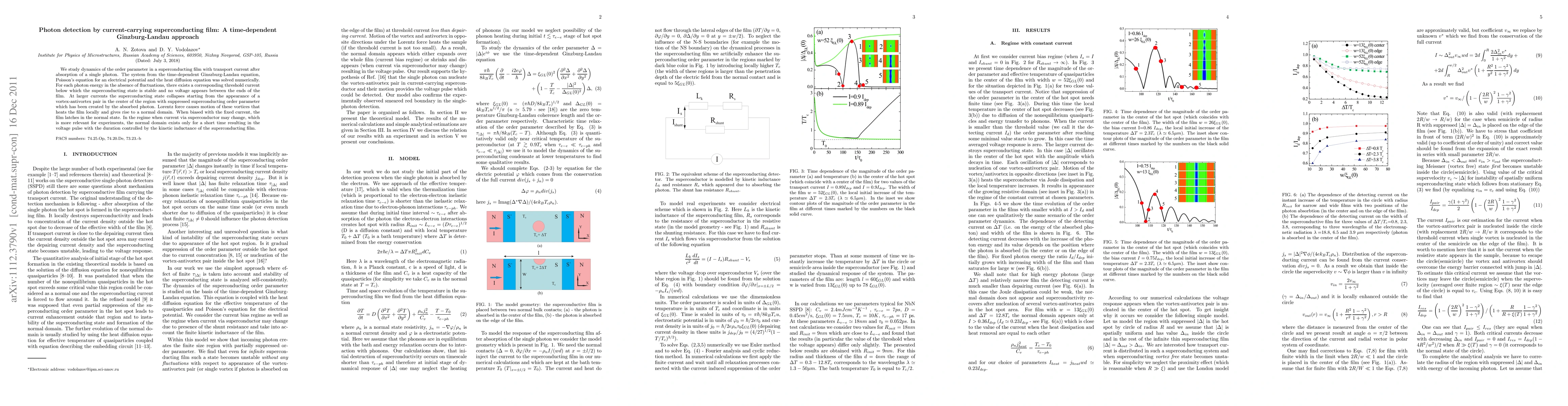 This paper investigates the dynamics of a superconducting film with transport current following photon absorption using a time-dependent Ginzburg-Landau approach. It finds that a threshold current exists below which the superconducting state remains stable, while above this threshold, vortices form and lead to localized heating and transient normal domains, resulting in voltage pulses.
