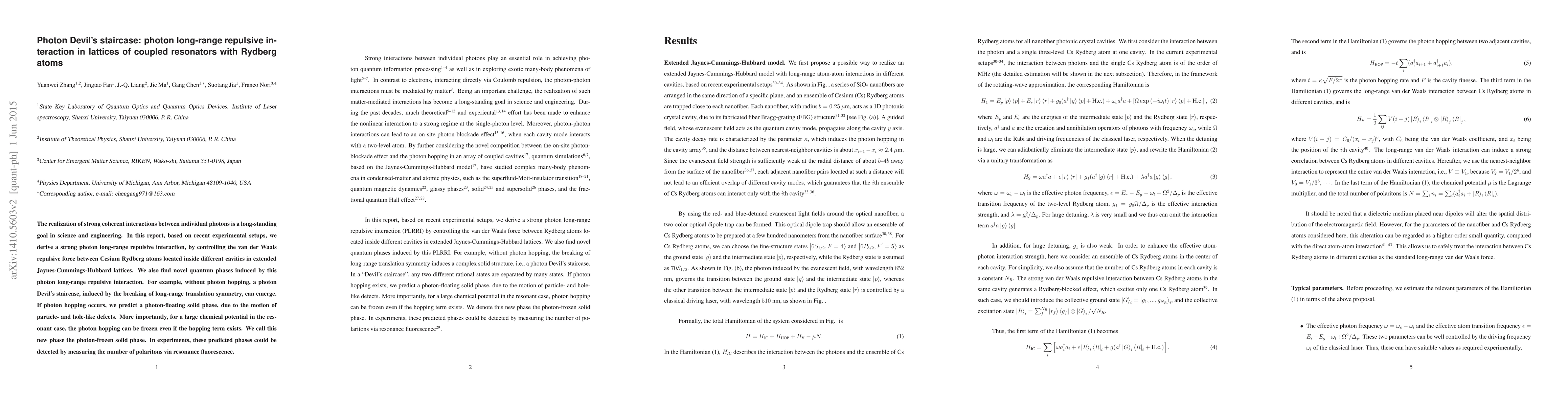 This paper reports the realization of strong photon long-range repulsive interactions in lattices of coupled resonators with Rydberg atoms, leading to novel quantum phases such as photon Devil's staircase and photon-frozen solid phase, detectable via resonance fluorescence.