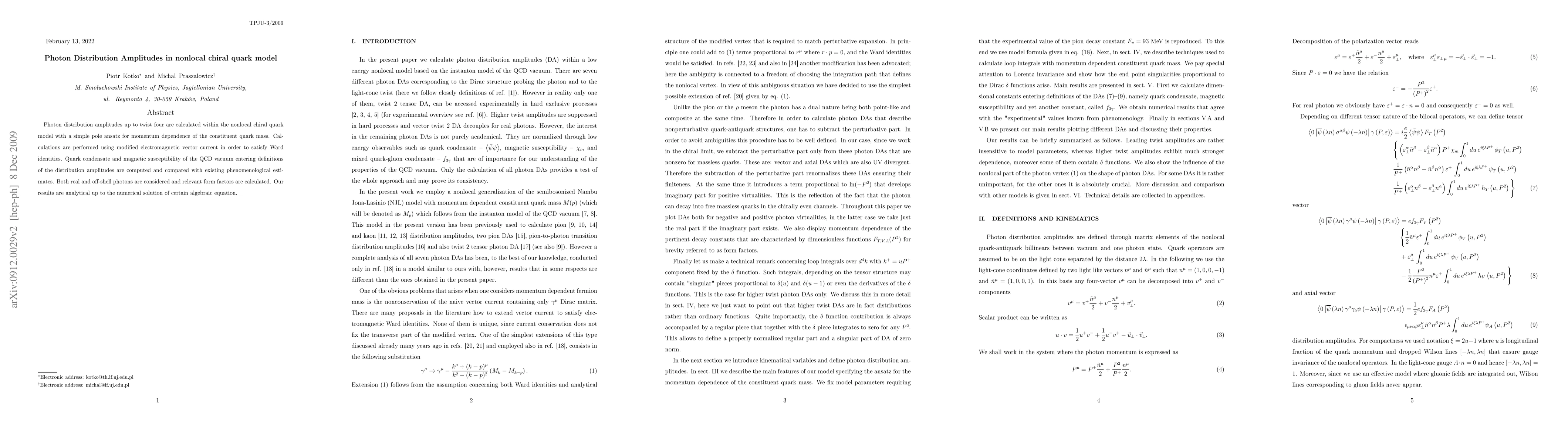 This paper calculates photon distribution amplitudes up to twist four in a nonlocal chiral quark model, employing a modified electromagnetic vector current to satisfy Ward identities. The study compares quark condensate and magnetic susceptibility results with phenomenological estimates and provides analytical results, resolved numerically for certain algebraic equations.