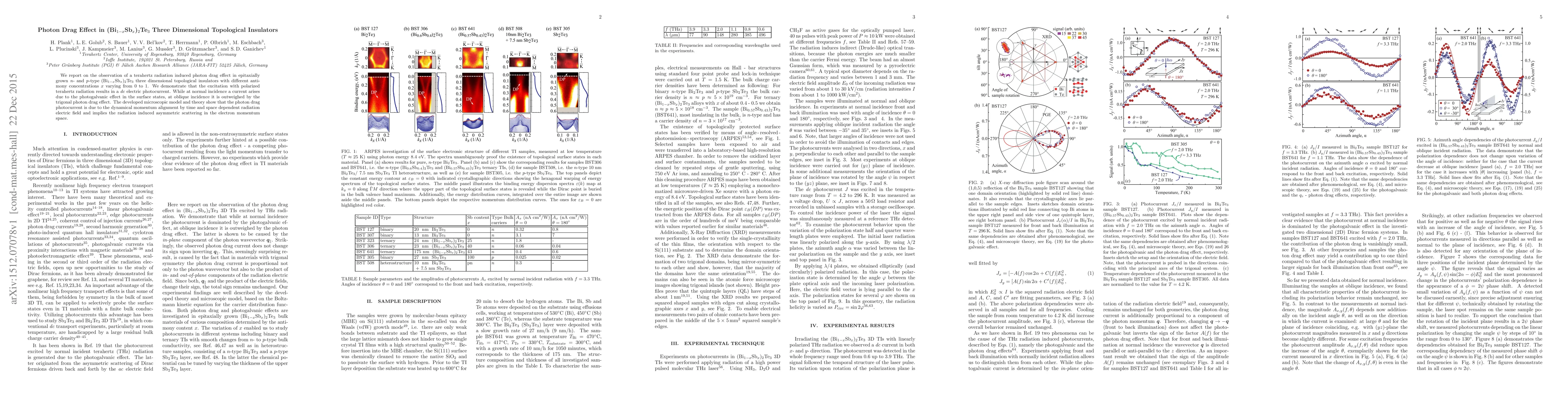 We report on the observation of a terahertz radiation induced photon drag effect in epitaxially grown $n$- and $p$-type (Bi$_{1-x}$Sb$_{x}$)$_{2}$Te$_{3}$ three dimensional topological insulators with different antimony concentrations $x$ varying from 0 to 1. We demonstrate that the excitation with polarized terahertz radiation results in a $dc$ electric photocurrent. While at normal incidence a current arises due to the photogalvanic effect in the surface states, at oblique incidence it is outweighed by the trigonal photon drag effect. The developed microscopic model and theory show that the photon drag photocurrent is due to the dynamical momentum alignment by time and space dependent radiation electric field and implies the radiation induced asymmetric scattering in the electron momentum space.