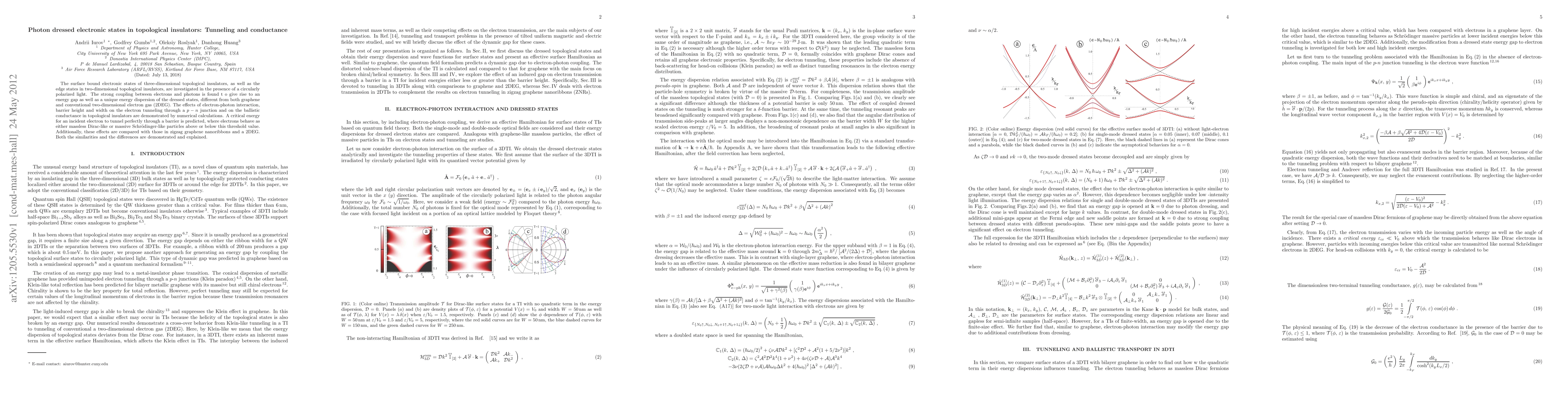 The surface bound electronic states of three-dimensional topological insulators, as well as the edge states in two-dimensional topological insulators, are investigated in the presence of a circularly polarized light. The strong coupling between electrons and photons is found t o give rise to an energy gap as well as a unique energy dispersion of the dressed states, different from both graphene and conventional two-dimensional electron gas (2DEG). The effects of electron-photon interaction, barrier height and width on the electron tunneling through a p-n junction and on the ballistic conductance in topological insulators are demonstrated by numerical calculations. A critical energy for an incident electron to tunnel perfectly through a barrier is predicted, where electrons behave as either massless Dirac-like or massive Schrodinger-like particles above or below this threshold value. Additionally, these effects are compared with those in zigzag graphene nanoribbons and a 2DEG. Both the similarities and the differences are demonstrated and explained.
