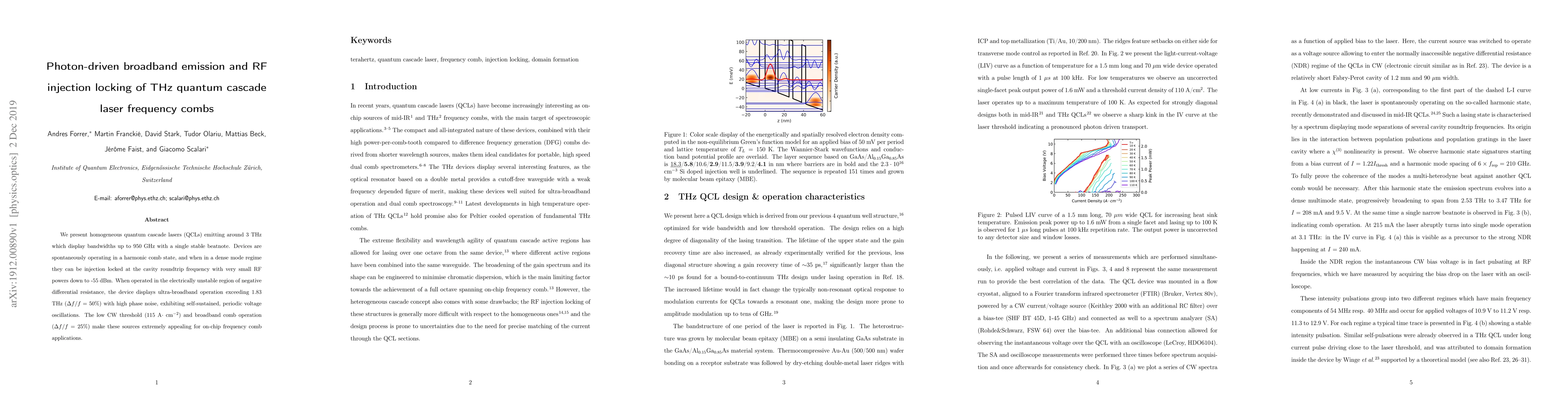 This paper investigates broadband emission and RF injection locking of THz quantum cascade lasers (QCLs) operating at 3 THz, showing bandwidths up to 950 GHz and stable beatnotes. The lasers can be injection locked with very low RF powers and exhibit ultra-broadband operation exceeding 1.83 THz, making them promising for on-chip frequency comb applications.