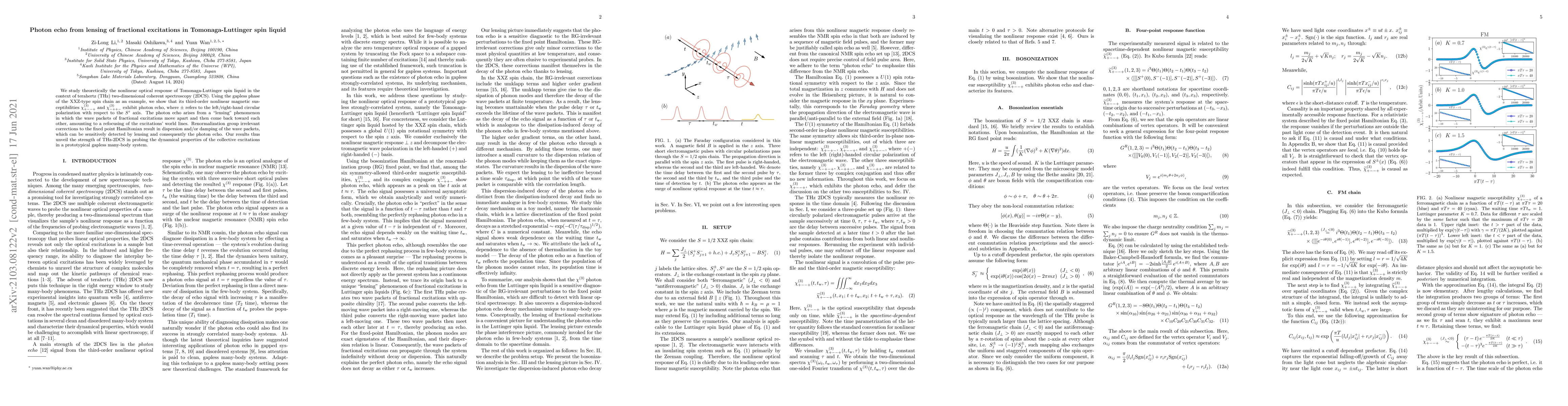 We study theoretically the nonlinear optical response of Tomonaga-Luttinger spin liquid in the context of terahertz (THz) two-dimensional coherent spectroscopy (2DCS). Using the gapless phase of the XXZ-type spin chain as an example, we show that its third-order nonlinear magnetic susceptibilities $\chi^{(3)}_{+--+}$ and $\chi^{(3)}_{-++-}$ exhibit photon echo, where $\pm$ refers to the left/right-hand circular polarization with respect to the $S^z$ axis. The photon echo arises from a ``lensing'' phenomenon in which the wave packets of fractional excitations move apart and then come back toward each other, amounting to a refocusing of the excitations' world lines. Renormalization group irrelevant corrections to the fixed point Hamiltonian result in dispersion and/or damping of the wave packets, which can be sensitively detected by lensing and consequently the photon echo. Our results thus unveil the strength of THz-2DCS in probing the dynamical properties of the collective excitations in a prototypical gapless many-body system.