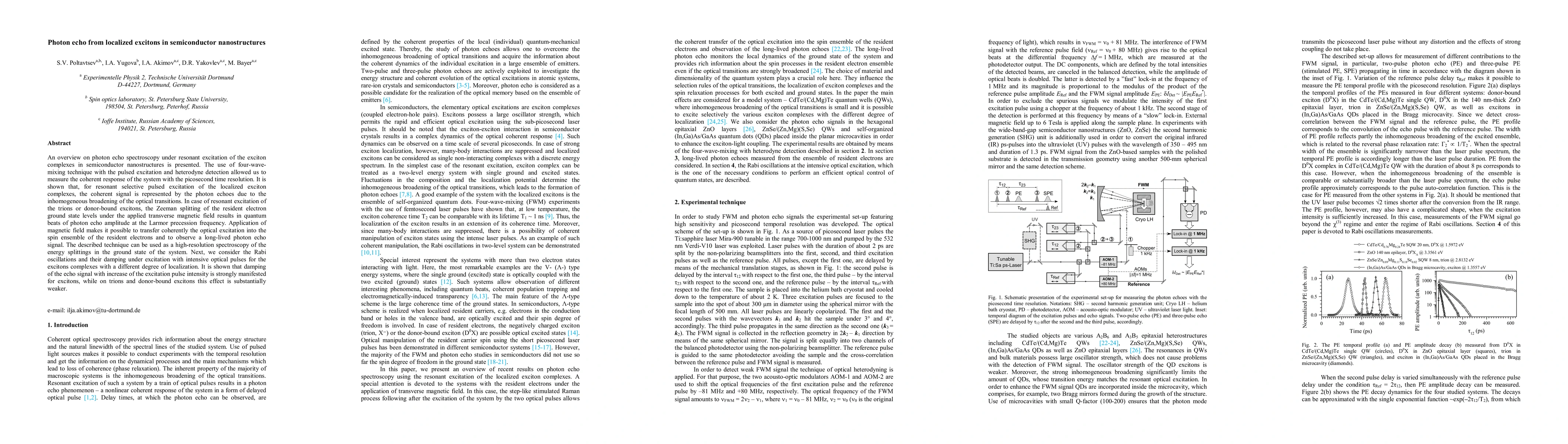 The paper discusses photon echo spectroscopy in semiconductor nanostructures using resonant excitation of exciton complexes. Employing four-wave-mixing with pulsed excitation and heterodyne detection, the study reveals picosecond-time-resolved coherent responses. It highlights that inhomogeneous broadening causes photon echoes, while Zeeman splitting in trions or donor-bound excitons under magnetic fields leads to quantum beats at Larmor frequency. The technique offers high-resolution energy splitting spectroscopy in the ground state and examines Rabi oscillations and damping under intense optical pulses for excitons of varying localization degrees.