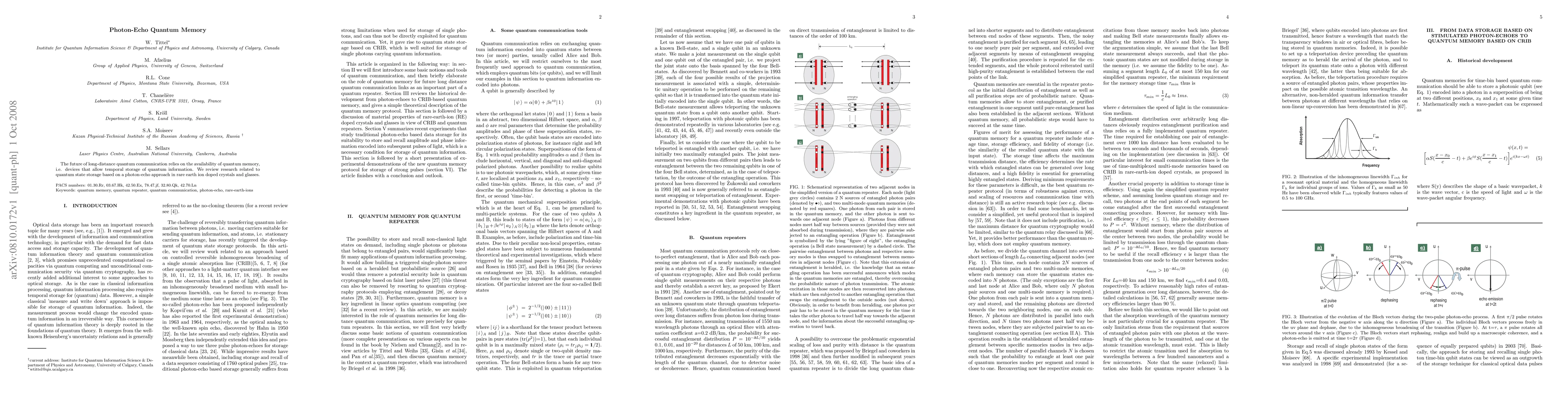 Summary: This paper reviews advancements in quantum memory technology using photon-echo techniques in rare earth ion-doped crystals and glasses, crucial for future long-distance quantum communication. The focus is on the temporal storage of quantum information.