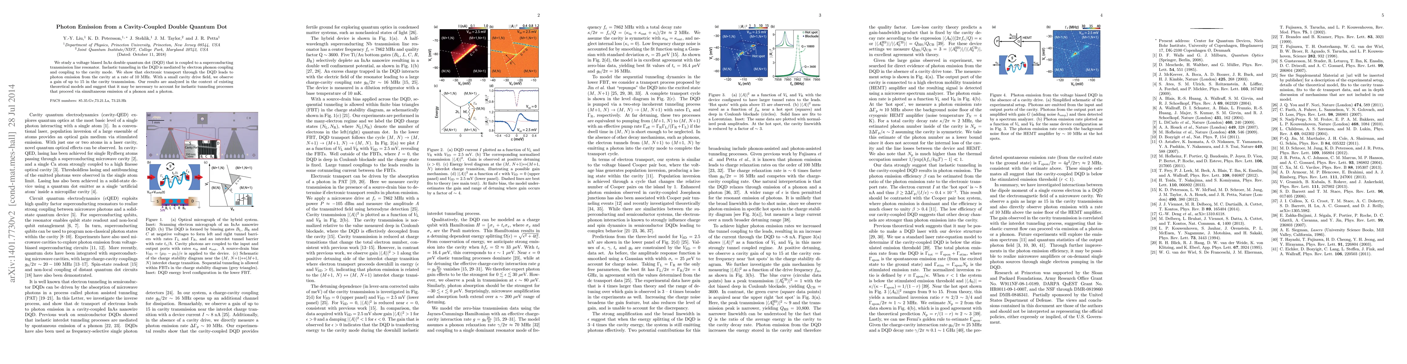 This paper investigates photon emission in a voltage-biased InAs double quantum dot coupled to a superconducting resonator, revealing a 10 MHz emission rate and up to 15-fold transmission gain. Theoretical models suggest considering inelastic tunneling involving phonon and photon emission for accurate analysis.