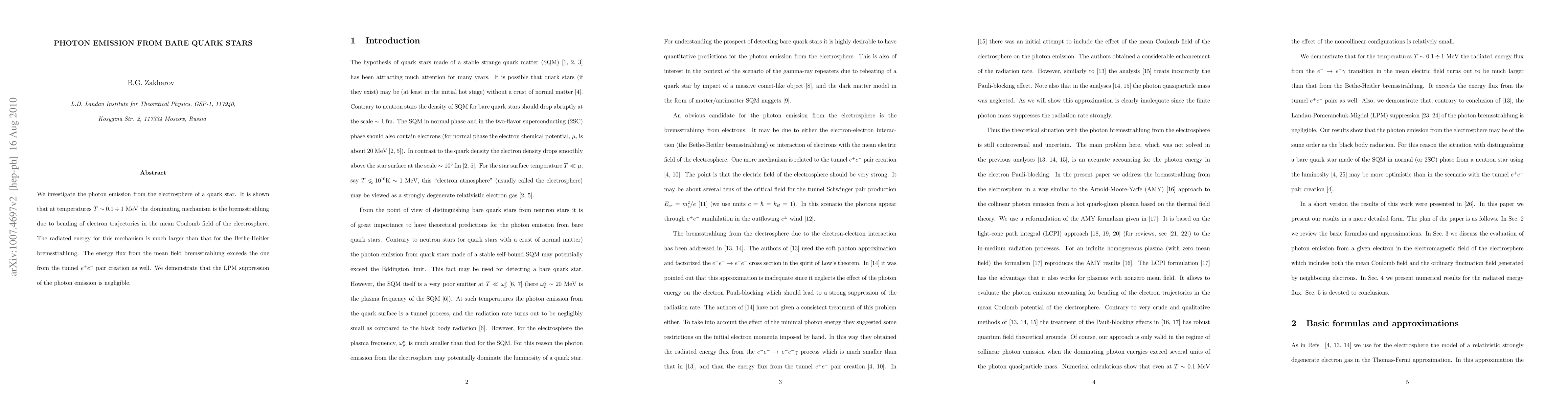 We investigate the photon emission from the electrosphere of a quark star. It is shown that at temperatures T\sim 0.1-1 MeV the dominating mechanism is the bremsstrahlung due to bending of electron trajectories in the mean Coulomb field of the electrosphere. The radiated energy for this mechanism is much larger than that for the Bethe-Heitler bremsstrahlung. The energy flux from the mean field bremsstrahlung exceeds the one from the tunnel e^{+}e^{-} pair creation as well. We demonstrate that the LPM suppression of the photon emission is negligible.