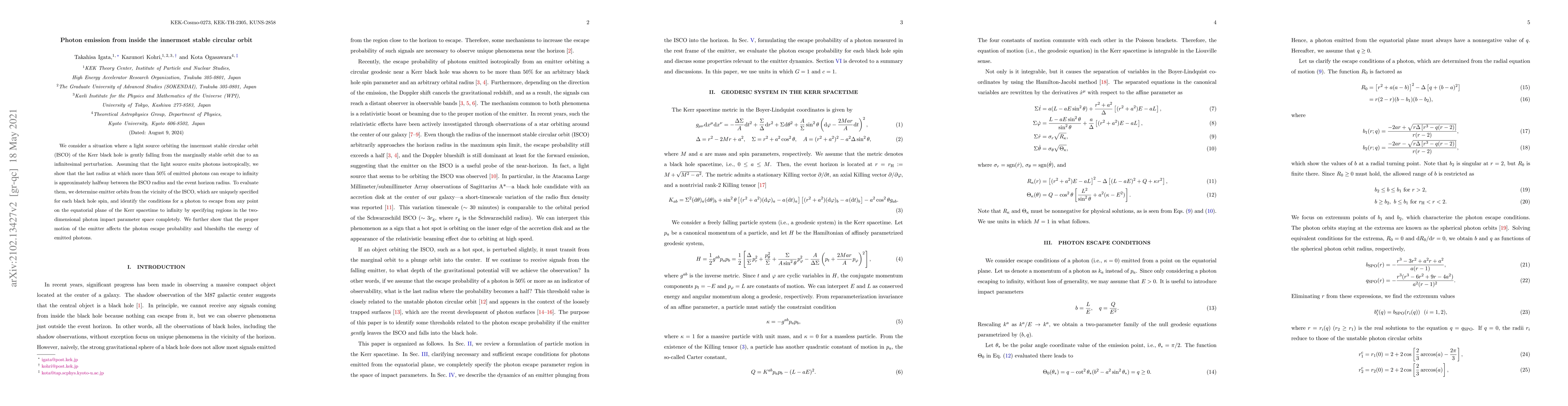 This paper investigates photon emission from a light source orbiting the innermost stable circular orbit (ISCO) of a Kerr black hole, demonstrating that the last radius for more than 50% of photons to escape to infinity is halfway between the ISCO and the event horizon. It also examines how the emitter's motion influences photon escape probability and energy blueshift.