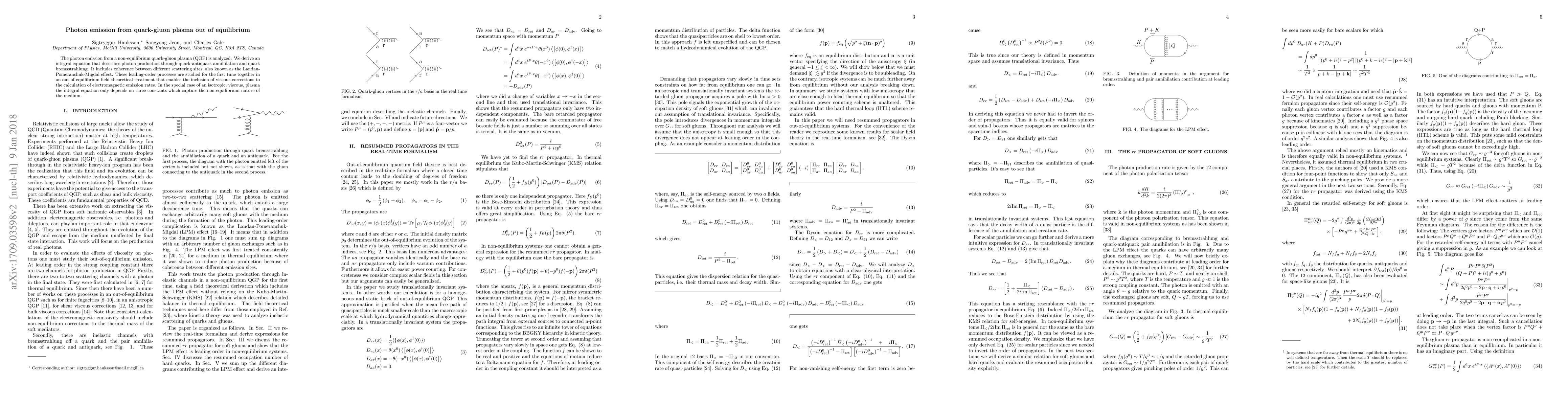 This paper analyzes photon emission from a non-equilibrium quark-gluon plasma, deriving an integral equation for leading-order processes including quark-antiquark annihilation and quark bremsstrahlung, with viscous corrections. It introduces the Landau-Pomeranchuk-Migdal effect and studies these processes for the first time in an out-of-equilibrium field theoretical framework.