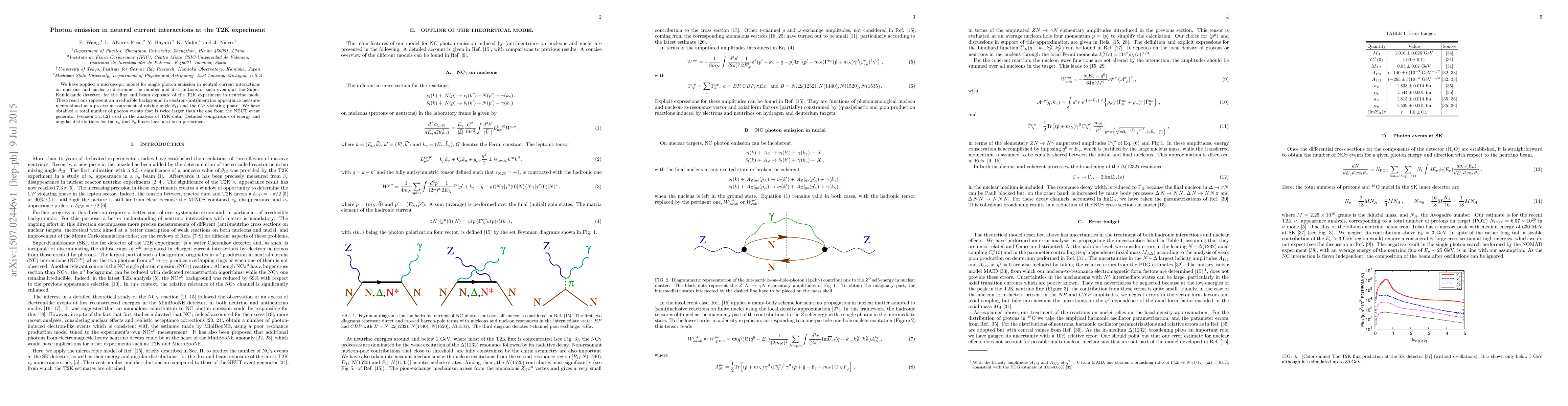 This paper applies a microscopic model to predict photon emission in neutral current interactions at the T2K experiment, finding a photon event count double that of the NEUT generator. The study aims to better understand irreducible background noise affecting electron-(anti)neutrino appearance measurements for $\theta_{13}$ and CP violation.
