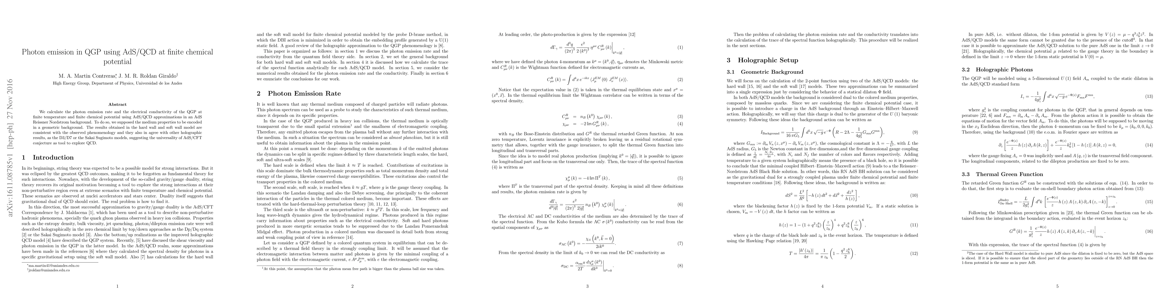This paper calculates the photon emission rate and electrical conductivity in quark-gluon plasma (QGP) at finite temperature and chemical potential using AdS/QCD approximations in an AdS Reissner-Nordstrom background, finding consistent results with observed phenomenology and supporting the universality of the AdS/CFT conjecture for exploring QCD.