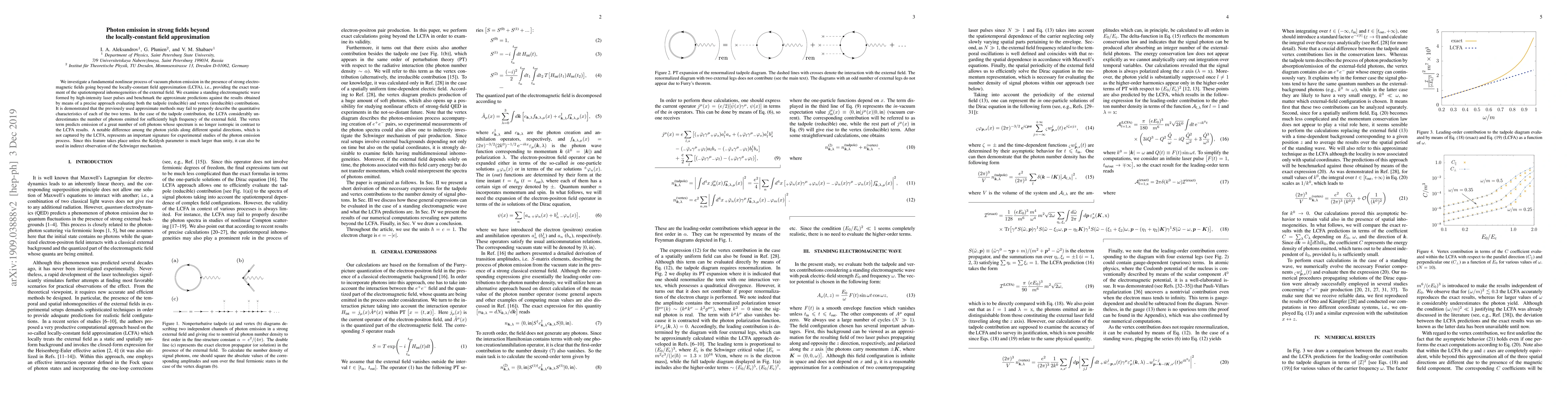 We investigate a fundamental nonlinear process of vacuum photon emission in the presence of strong electromagnetic fields going beyond the locally-constant field approximation (LCFA), i.e., providing the exact treatment of the spatiotemporal inhomogeneities of the external field. We examine a standing electromagnetic wave formed by high-intensity laser pulses and benchmark the approximate predictions against the results obtained by means of a precise approach evaluating both the tadpole (reducible) and vertex (irreducible) contributions. It is demonstrated that the previously used approximate methods may fail to properly describe the quantitative characteristics of each of the two terms. In the case of the tadpole contribution, the LCFA considerably underestimates the number of photons emitted for sufficiently high frequency of the external field. The vertex term predicts emission of a great number of soft photons whose spectrum is no longer isotropic in contrast to the LCFA results. A notable difference among the photon yields along different spatial directions, which is not captured by the LCFA, represents an important signature for experimental studies of the photon emission process. Since this feature takes place unless the Keldysh parameter is much larger than unity, it can also be used in indirect observation of the Schwinger mechanism.