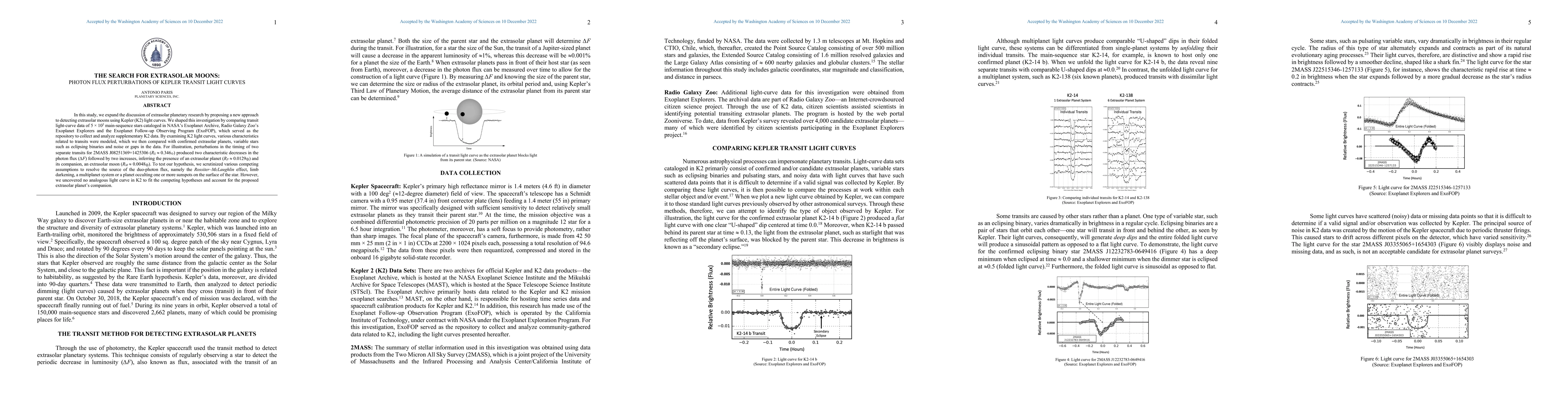 In this study, we expand the discussion of extrasolar planetary research by proposing a new approach to detecting extrasolar moons using Kepler (K2) light curves. We shaped this investigation by comparing transit light curve data of ~5000 main-sequence stars cataloged in the NASA Exoplanet Archive, the Radio Galaxy Zoo Exoplanet Explorers and the Exoplanet Follow Up Observing Program, which served as the repository to collect and analyze supplementary K2 data. By examining K2 light curves, various characteristics related to transits were modeled, which we then compared with confirmed extrasolar planets, variable stars such as eclipsing binaries and noise or gaps in the data. For illustration, perturbations in the timing of two separate transits for 2MASS J08251369+1425306 (Rs ~ 0.346) produced two characteristic decreases in the photon flux followed by two increases, inferring the presence of an extrasolar planet (Rp ~ 0.0129) and its companion, an extrasolar moon (Rm ~ 0.0048). To test our hypothesis, we scrutinized various competing assumptions to resolve the source of the duo photon flux, namely the Rossiter McLaughlin effect, limb darkening, a multiplanet system or a planet occulting one or more sunspots on the surface of the star. However, we uncovered no analogous light curve in K2 to fit the competing hypotheses and account for the proposed extrasolar companion.