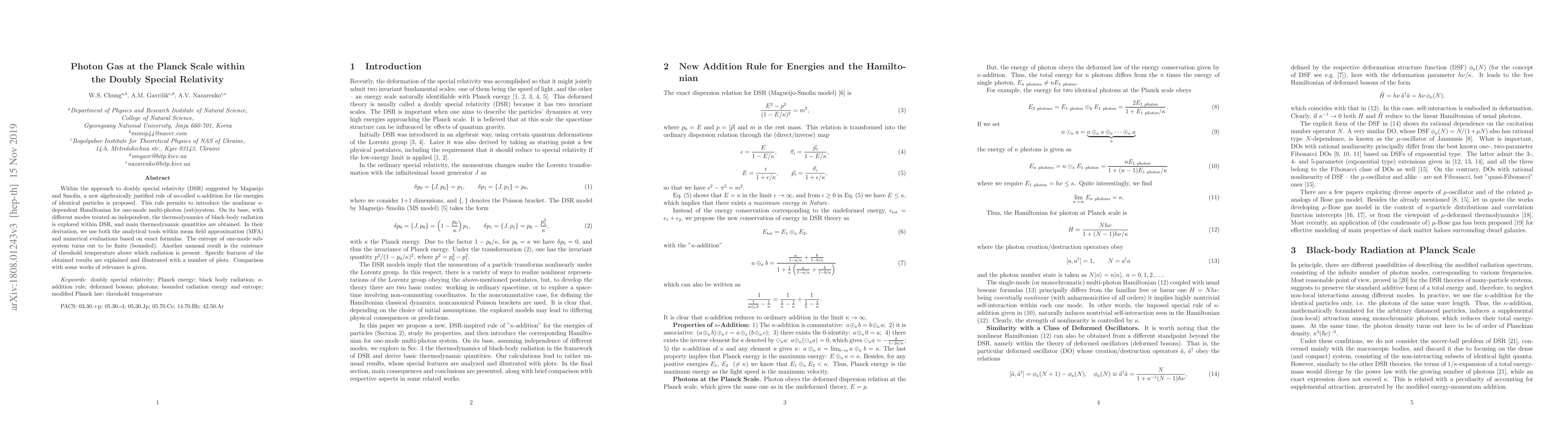 This paper proposes a new $\kappa$-addition rule within doubly special relativity to study the thermodynamics of black-body radiation at the Planck scale, deriving a finite entropy and a threshold temperature for radiation presence, and comparing results with relevant works.