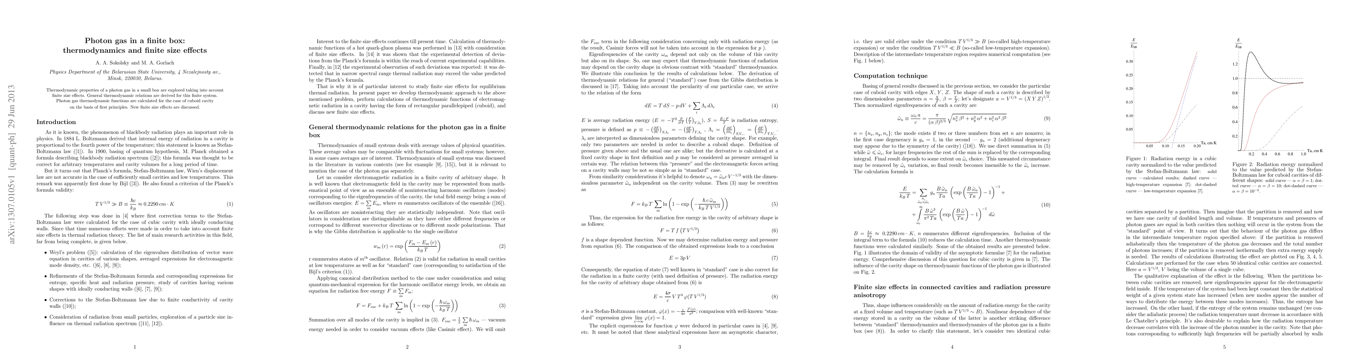 This paper investigates the thermodynamic properties of a photon gas confined in a small cuboid cavity, deriving general relations and calculating thermodynamic functions while considering finite size effects. It also discusses novel finite size phenomena arising from the confined photon gas.