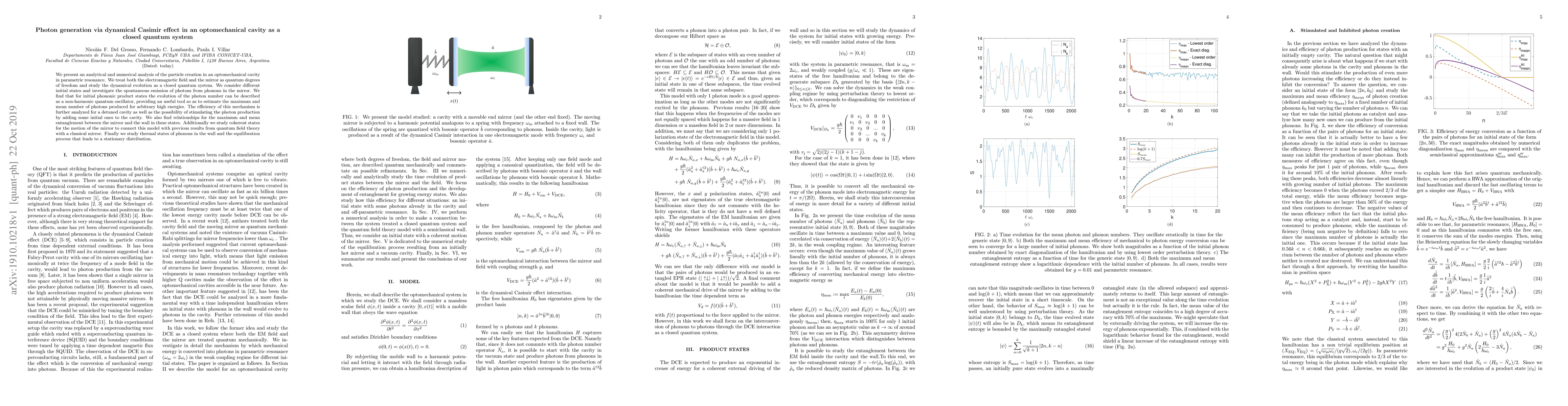 This paper investigates photon generation via the dynamical Casimir effect in an optomechanical cavity, treating both the electromagnetic field and the mirror as quantum systems. It finds that initial phononic product states lead to a non-harmonic quantum oscillator evolution, enabling estimation of photon production, and explores entanglement and thermal state equilibration.