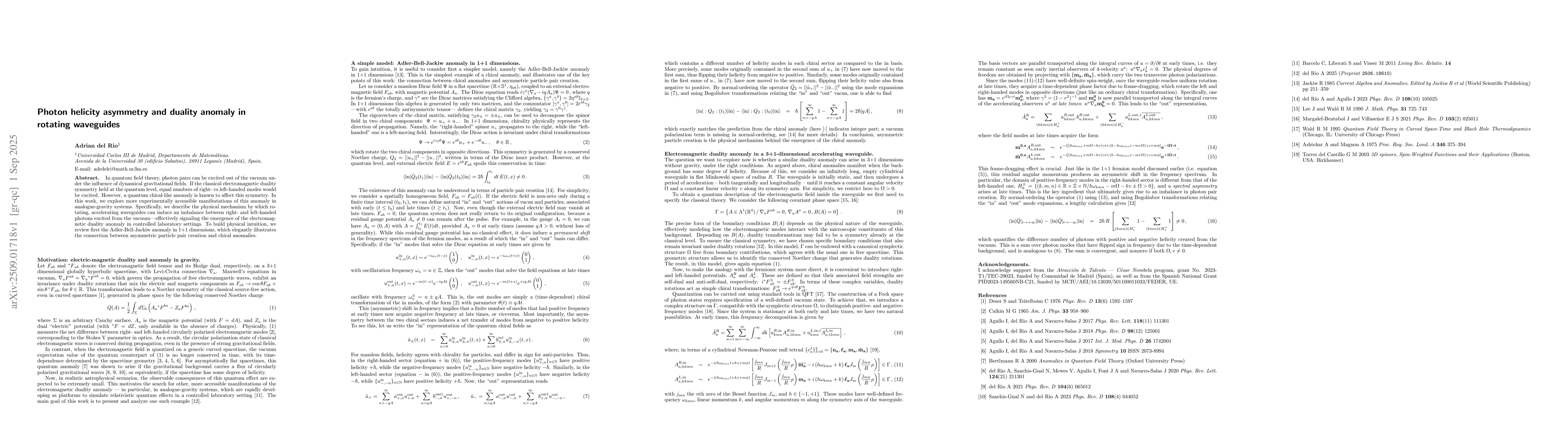 In quantum field theory, photon pairs can be excited out of the vacuum under the influence of dynamical gravitational fields. If the classical electromagnetic duality symmetry held at the quantum level, equal numbers of right- vs left-handed modes would be excited. However, a quantum chiral-like anomaly is known to affect this symmetry. In this work, we explore more experimentally accessible manifestations of this anomaly in analogue-gravity systems. Specifically, we describe the physical mechanism by which rotating, accelerating waveguides can induce an imbalance between right- and left-handed photons excited from the vacuum -- effectively signaling the emergence of the electromagnetic duality anomaly in controlled laboratory settings. To build physical intuition, we review first the Adler-Bell-Jackiw anomaly in 1+1 dimensions, which elegantly illustrates the connection between asymmetric particle pair creation and chiral anomalies.