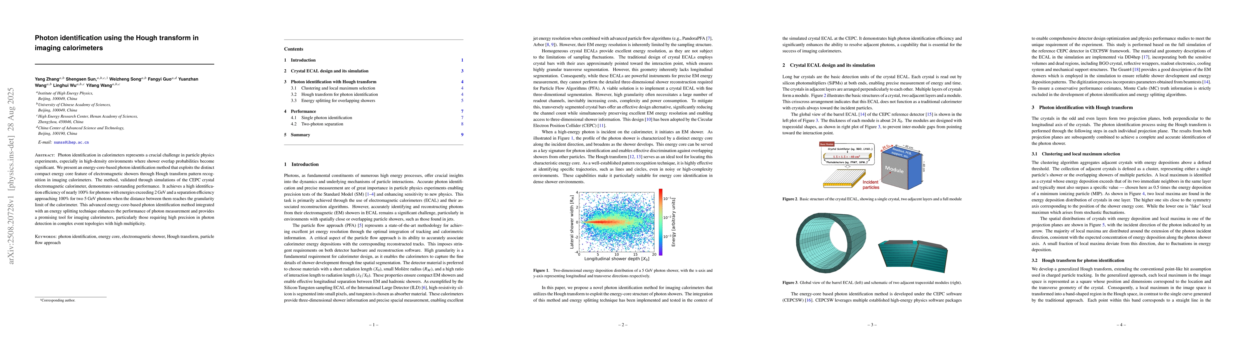 Photon identification in calorimeters represents a crucial challenge in particle physics experiments, especially in high-density environments where shower overlap probabilities become significant. We present an energy-core-based photon identification method that exploits the distinct compact energy core feature of electromagnetic showers through Hough transform pattern recognition in imaging calorimeters. The method, validated through simulations of the CEPC crystal electromagnetic calorimeter, demonstrates outstanding performance. It achieves a high identification efficiency of nearly 100% for photons with energies exceeding 2 GeV and a separation efficiency approaching 100% for two 5 GeV photons when the distance between them reaches the granularity limit of the calorimeter. This advanced energy-core-based photon identification method integrated with an energy splitting technique enhances the performance of photon measurement and provides a promising tool for imaging calorimeters, particularly those requiring high precision in photon detection in complex event topologies with high multiplicity.