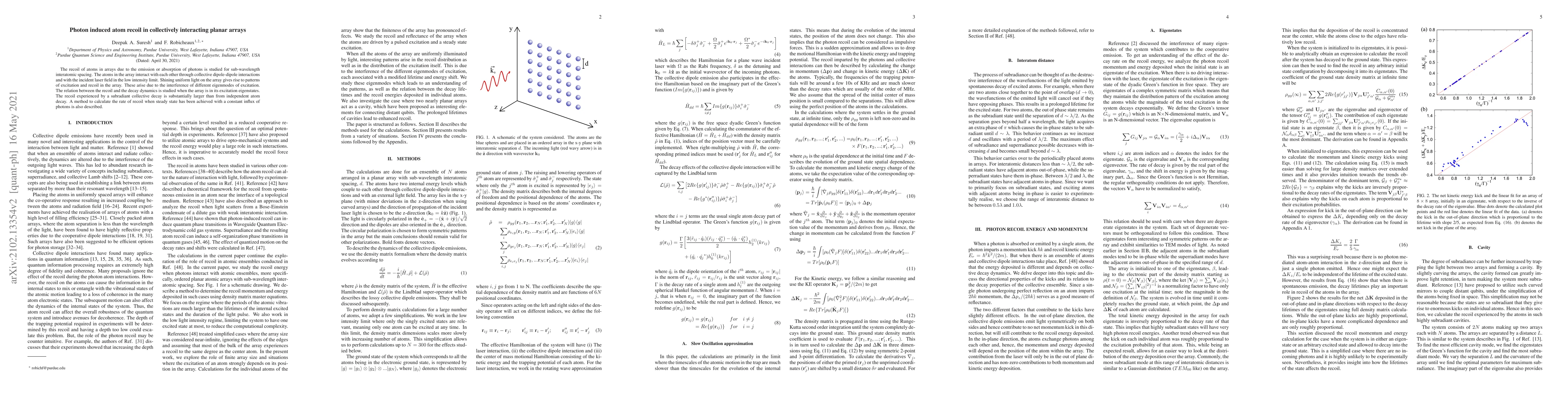 Researchers studied how photons cause atoms in a closely packed array to recoil when excited, finding that subradiant collective decay leads to larger recoil than independent atom decay. A method for calculating the rate of recoil is also described.