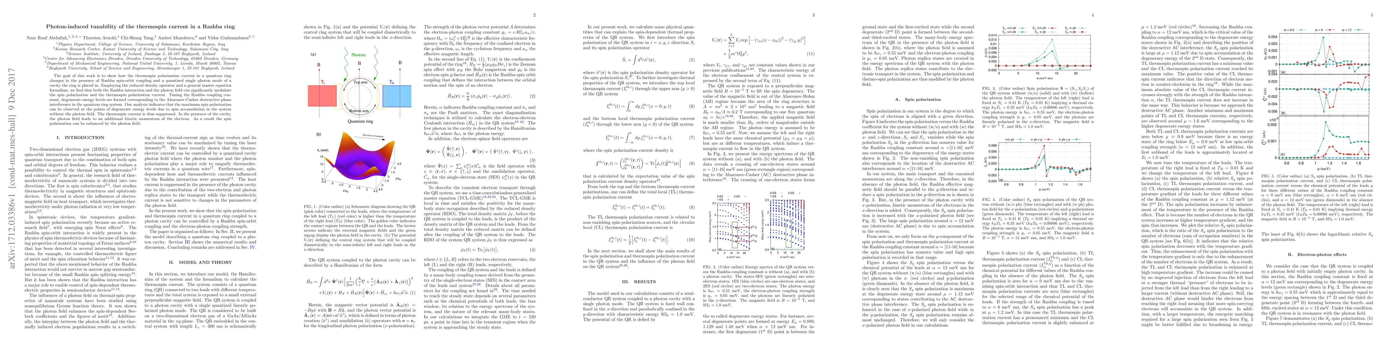 This paper investigates how thermospin polarization current in a quantum ring with Rashba spin-orbit coupling is modulated by a single photon mode in a cavity. The study reveals that both Rashba interaction and the photon field can significantly affect spin polarization, with the photon field enhancing it and the thermospin current being suppressed at points of degenerate energy levels.